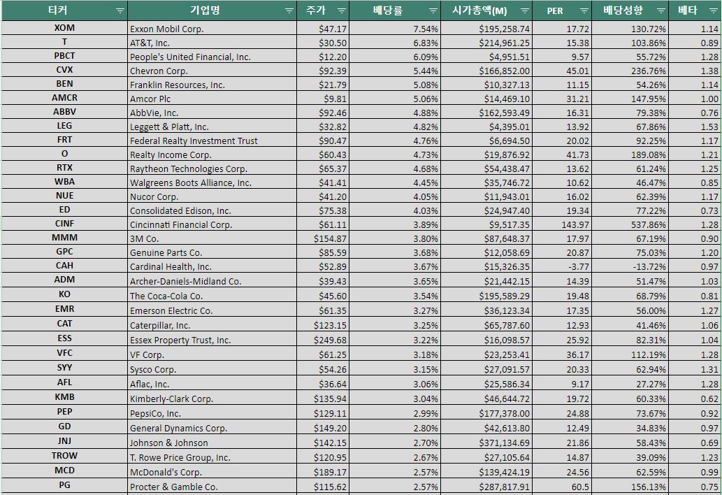 아래 기업들은 배당을 N년 이상 동안 배당을 연속으로 지급하거나, 꾸준히 배당을 증액시키는 기업 리스트입니다. 위 리스트의 기업들은 6-7%의 고배당주보다 상대적으로 안정성이 있다고 할 수 있습니다. 수 십년 동안 배당을 꾸준히 상승 및 연속지급했다는 의미는 수 많은 위험을 겪고도 주주에게 배당을 지급했다는 의미가 있기 때문입니다. 과거에도 배당을 지급했으니 미래에도 배당금을 안정적으로 지급할 가능성이 높다고 할 수 있어요. 물론 100% 상관관계가 있는 것은 아니지만요.