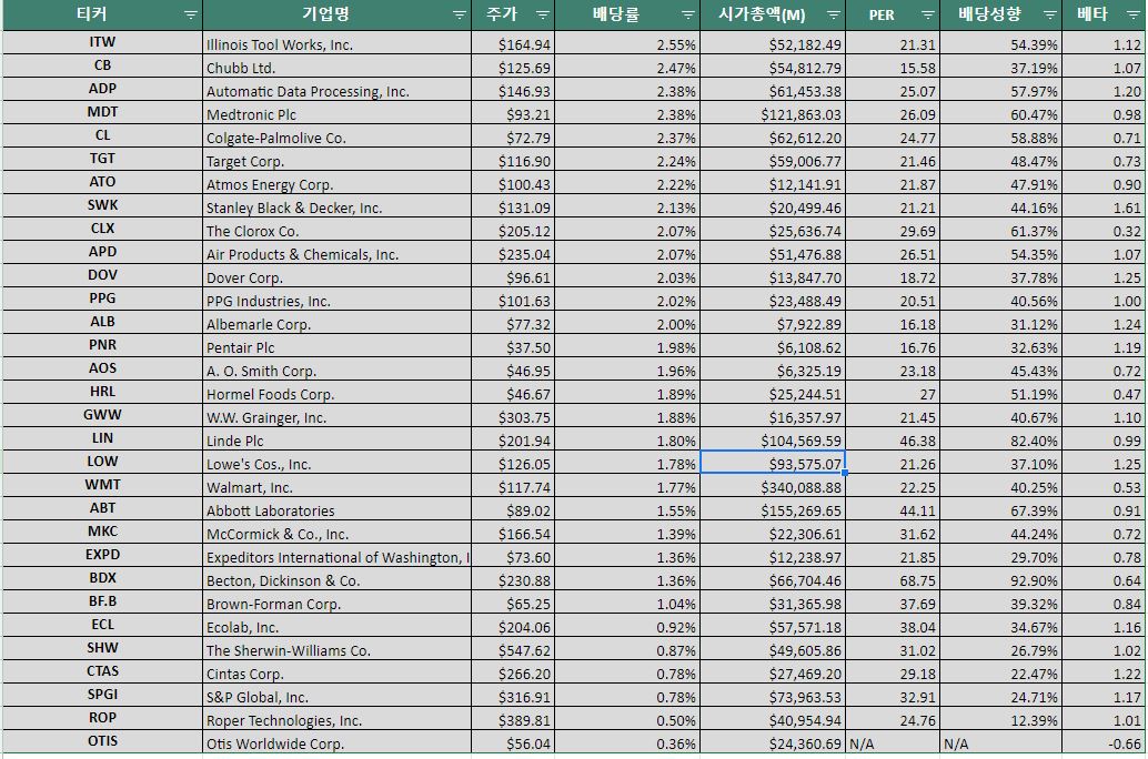 배당을 25년 이상 꾸준히 상승 및 연속지급한 기업 목록입니다.