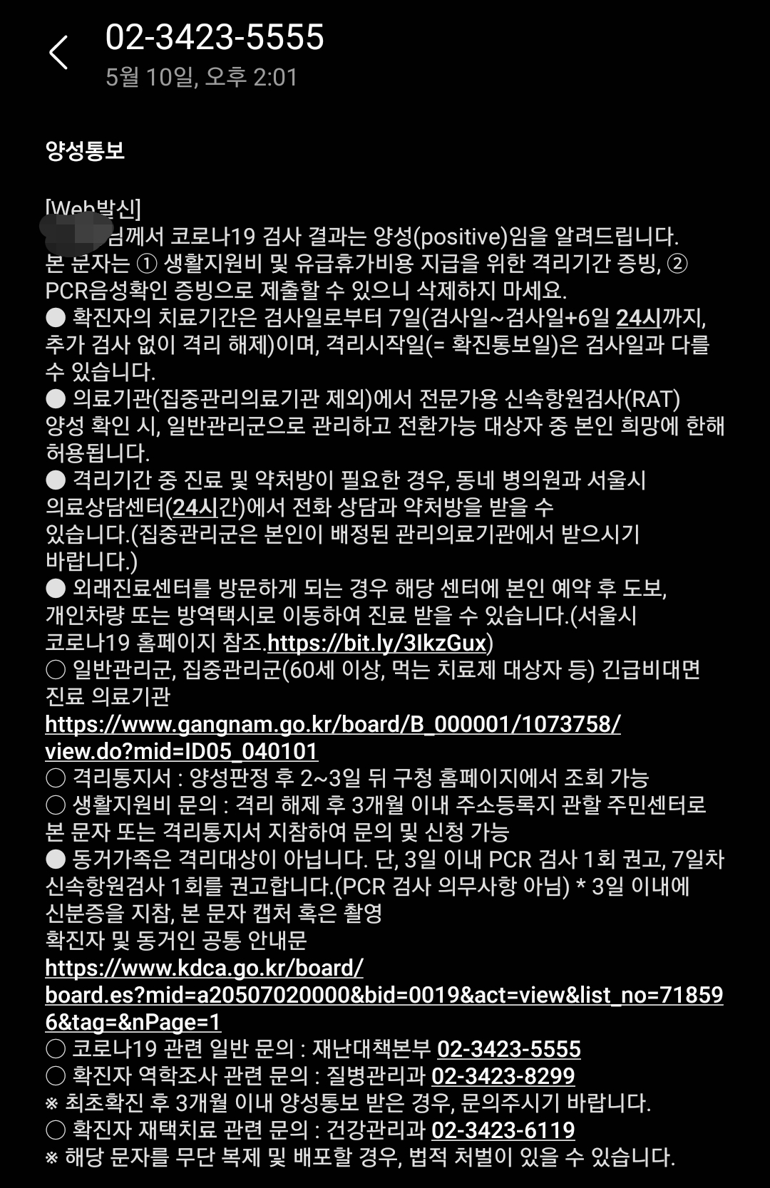 감염일로 추정되는 날이 5월 6일이었는데 약 2일 동안은 증상 없는 잠복기로 지나갔어요. 어버이날 기념으로 6일에는 친정을, 7일에는 시댁을 찾아뵙고 식사를 했는데 저로 인해 확진된 가족들은 없어서 참 다행이었답니다. 아마 증상이 발현되지 않으면 전파도 되지 않는 것 같아요.