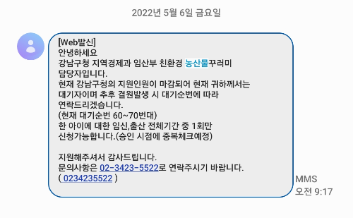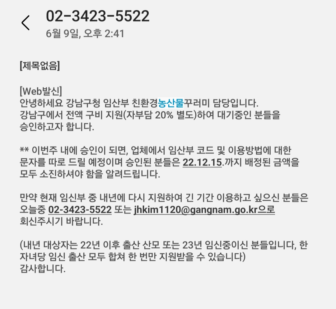 구에서 전액 구비 지원으로 하여 대기자를 승인해준다는 문자였는데요. 친환경 농산물 꾸러미는 국고 지원 40%, 지방비(시 혹은 구 차원) 40%, 자부담 20%로 사업이 진행되는 걸로 알고 있었는데, 구 자체적으로 국고 지원을 받지 않고 지원을 해주는 것 같습니다. 임산부 혜택이 다른 구보다 뛰어난 부분은 없다고 느꼈는데 뜻밖의 혜택을 받으니 예산이 많이 남나보다.. 싶기도 했고, 유용하게 써야겠다 싶었습니다.