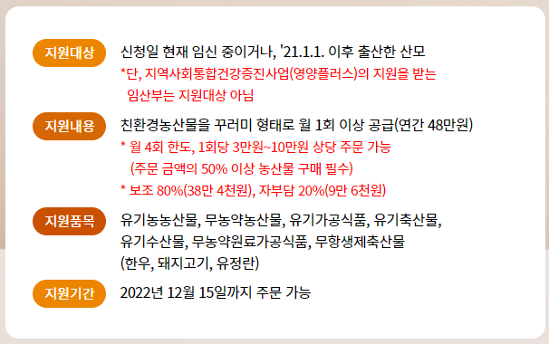 현재 임신 중이거나 2021년에 출산한 산모를 대상으로 친환경 농산물을 저렴한 값에 제공하는 혜택이에요.