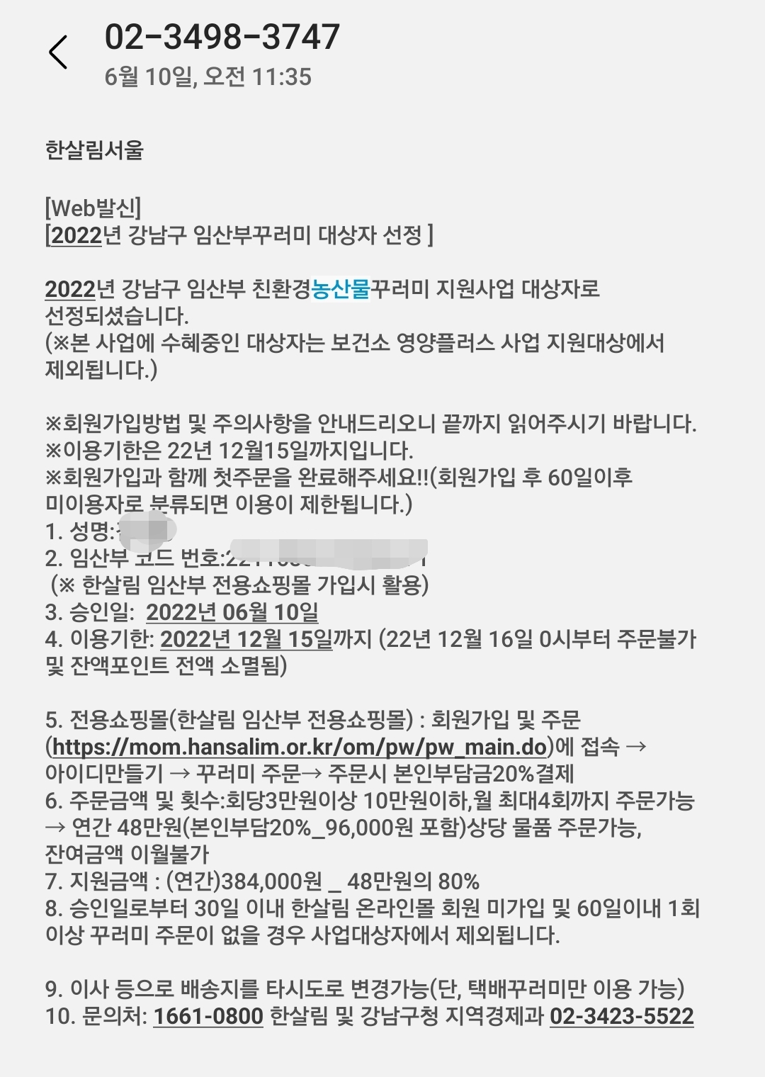 다음 날 한살림에서 문자 한통이 왔습니다. 전국 각지마다 제휴된 친환경쇼핑몰이 다른 것으로 알고 있는데 강남구는 한살림이더군요. 개인적으로 두레 생협을 좋아하기는 합니다만(품질이나 가격적으로나) 한살림도 유명한 생협이니 기분 좋게 이용해 봅니다. 사실 바우처 형식으로 오프라인 한살림 매장에 직접 방문하면 좋을 것 같은데 일단 한살림이 제휴된 지자체는 매장 방문 후 구매는 불가한 것으로 알고 있어요. 물론 집 앞까지 배송해주는 건 참 좋은 서비스지만 가뜩이나 낮은 퀄리티로 논란이 많은 사업인데 매장 방문이 가능토록 한다면 논란이 사라지지 않을까 싶기도 합니다.