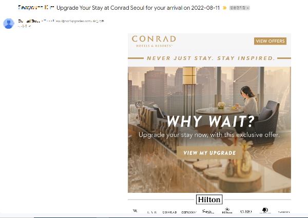 예약을 하고 난 후에 콘래드 서울에서 수상한 메일이 왔습니다. 유상 업그레이드를 해준다는 오퍼였는데요. 힐튼 공식 홈페이지에서 처음 예약을 해봐서 이런 메일이 참 생소하여 검색을 해보았습니다. 검색을 해보니 힐튼 공홈에서 예약하면 자동으로 오는 메일이라고 하더라고요. 그래서 저는 핫딜은 아닌가보다 생각했습니다.