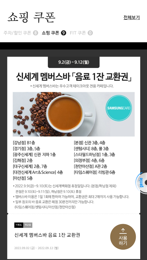 쇼핑 쿠폰에는 주차 할인 쿠폰이 있는가 하면, 제가 앞에 말씀드린 멤버스바 음료교환권과, 식사&디저트 5,000원 금액 할인 쿠폰이 확인됩니다. 유효기간이 한달이면 좋으련만.. 보통 금~월이면 만료가 되기 때문에 주말에 사용해야하는 쿠폰이라고 보시면 됩니다. 음료 1잔 교환권은 카드사별로 2장, 식사&디저트 5,000원 금액 할인 쿠폰(스사사에서는 델리쿠폰이라고 불림) 1장이 제공됩니다. 카드사별로 카드를 갖고 있는 분들은 해당 쿠폰들이 더 많이 들어오게 되겠죠~ 만약 동행하시는 분도 해당 쿠폰을 발급받으셨다고 하면 더 혜택은 커질겁니다.