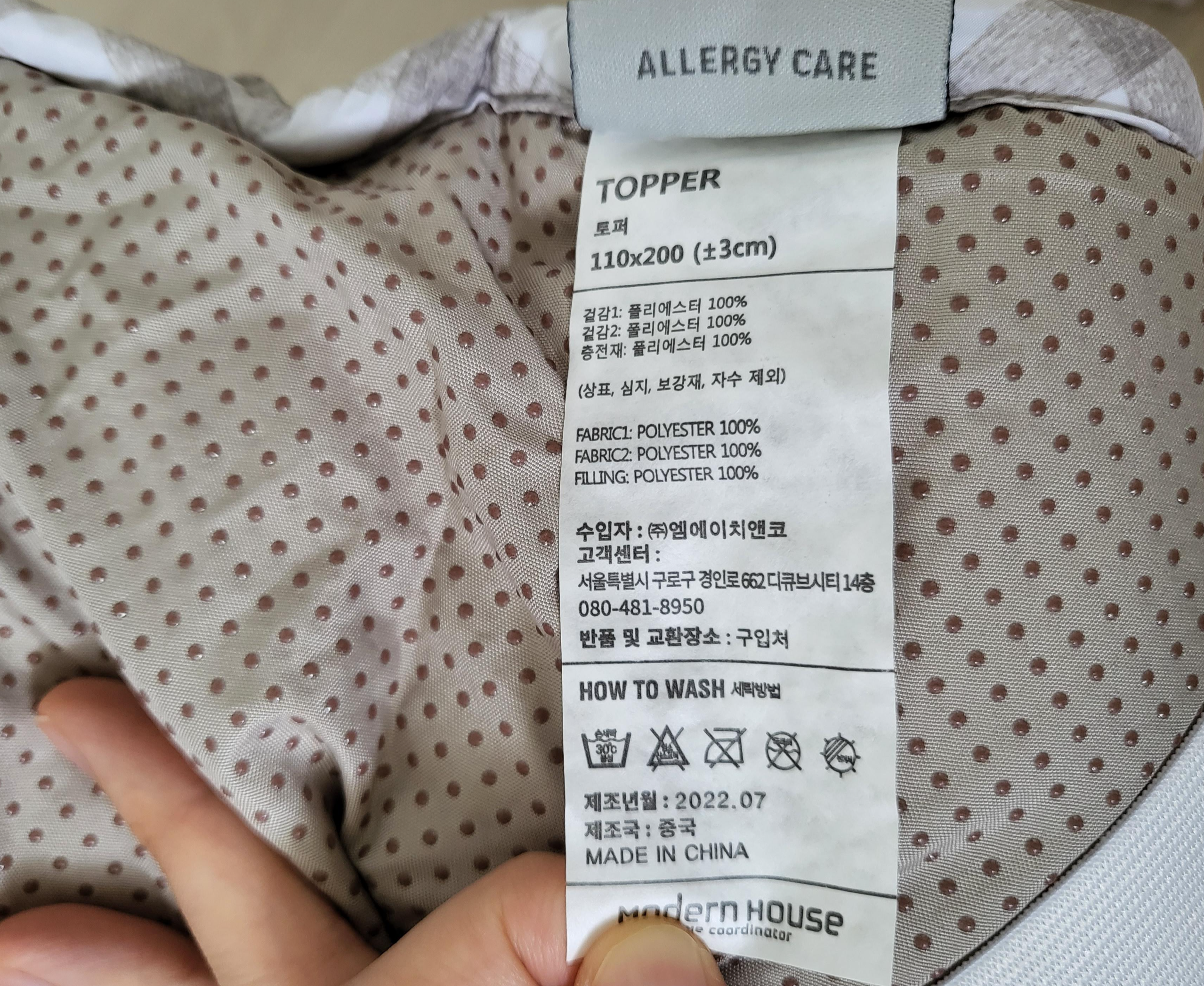 소프트워싱 매트리스커버는 찬물에 단독 손세탁을 권장하고 있네요....? 그냥 세탁망에 넣어서 세탁기를 돌리지 않을까 싶긴합니다^^;;; 두 제품 모두 중국산이긴 합니다만 제조년월을 보니 2022년 7월 제품으로 이월상품은 아니기에 마음에 위안을 삼습니다. 확실히 재질만 살펴봤을 때는 알러지케어 싱글토퍼 제품이 먼지가 달라붙지 않을 것 같은 느낌이에요. 세탁 빈도 수도 그만큼 줄어들 것 같고요.