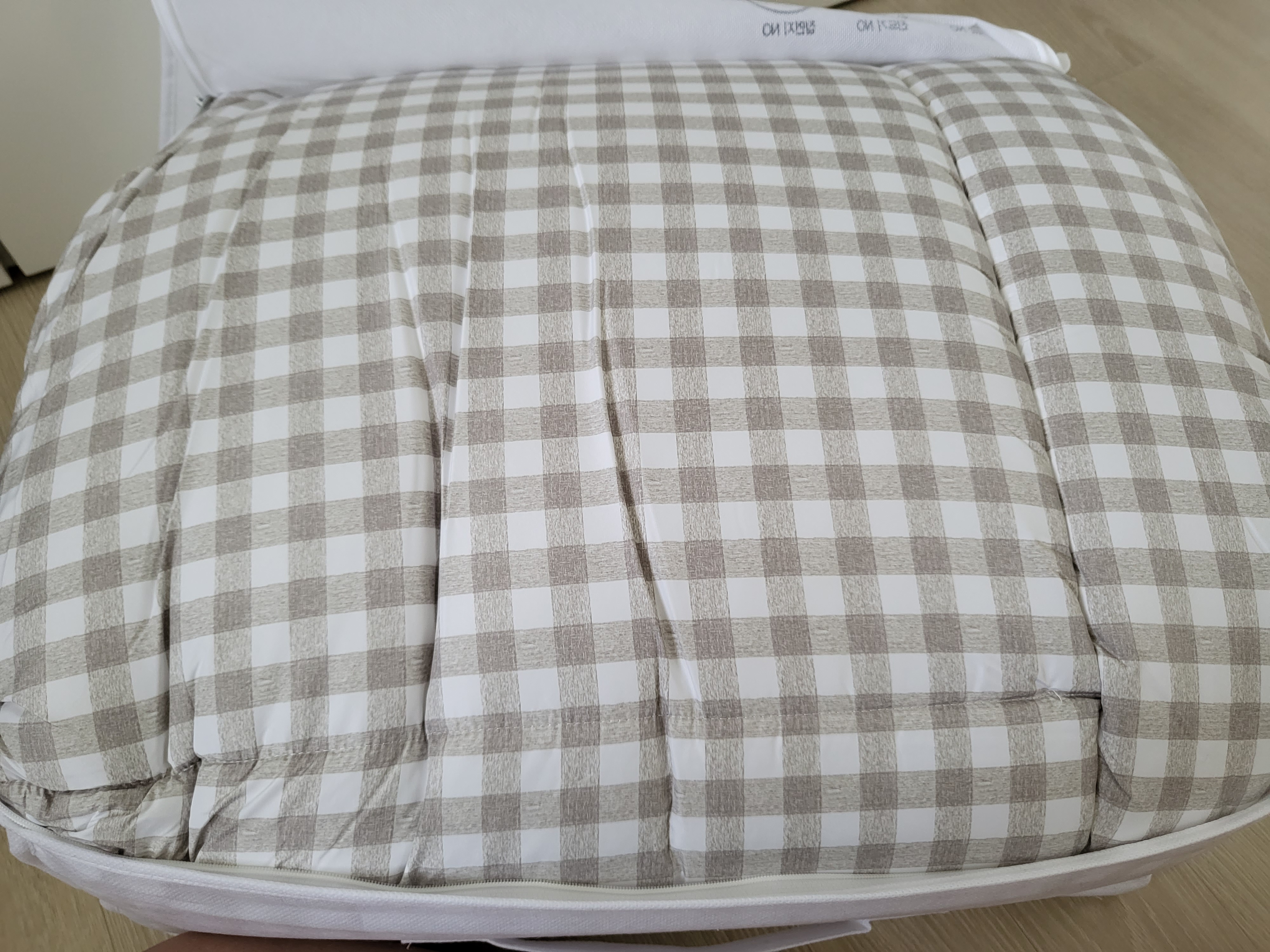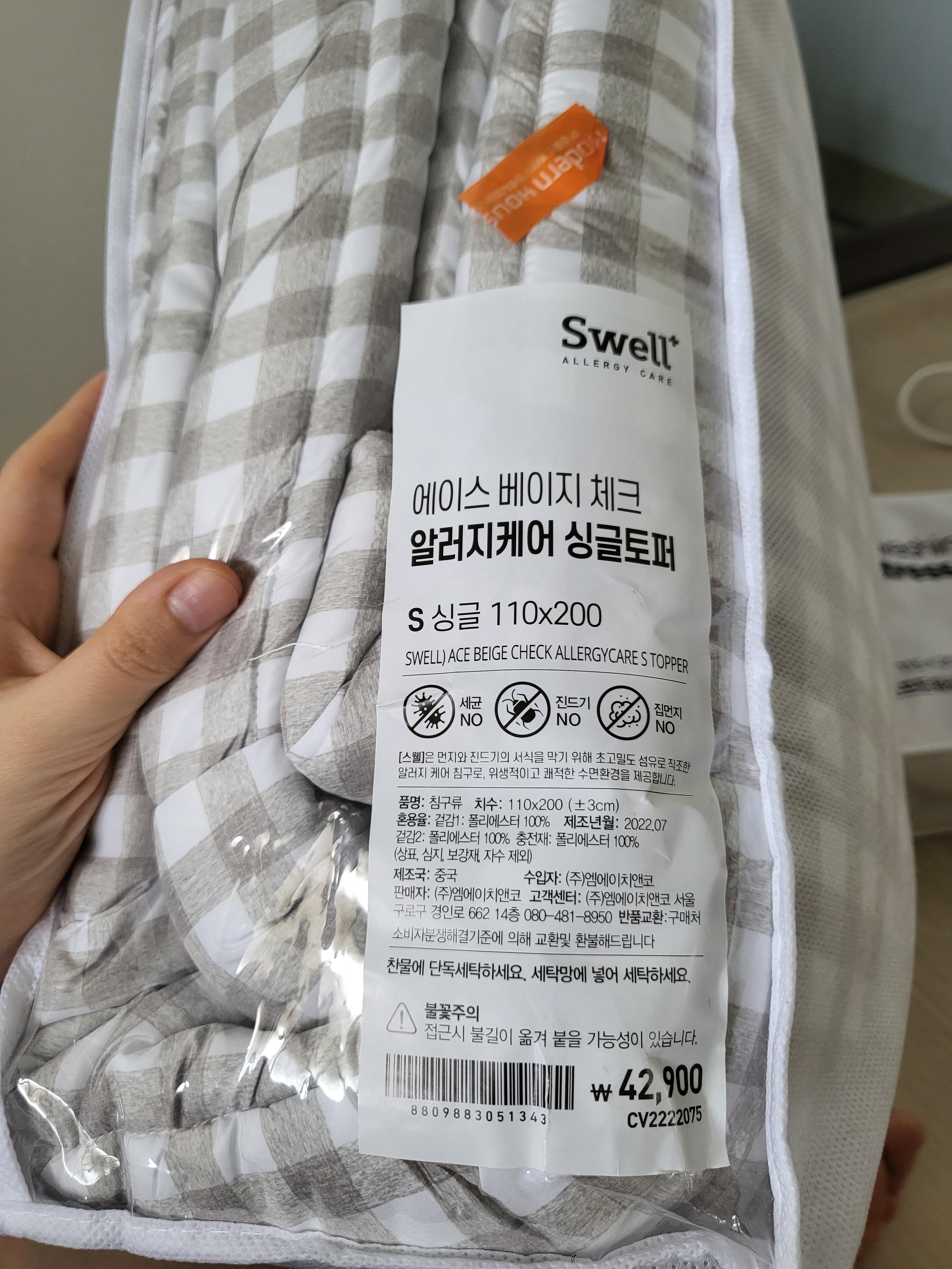 바로 스웰 에이스 베이지 체크 알러지케어 토퍼인데요. 알레르망, 세사 제품처럼 서걱서걱 재질의 제품이더라고요. 소프트워싱 패드가 가격적인 측면에서는 매력적이긴 했지만... 이 제품은 토퍼라서 소프트워싱 패드보다 더 폭신하고 먼지가 덜 달라붙는다는 점에서 맘에 들었습니다. 사실 알러지케어 제품(저희 집 이불 모두 세사...)은 건조기 사용 불가이기 때문에 남편이 불편해했거든요. 그럼에도 불구하고 남편이 이게 맘에 든다고 하더라고요ㅎㅎㅎ어차피 대부분의 이불 빨래는 남편이 하기 때문에.... 남편이 좋다면야 상관없다 싶었습니다.