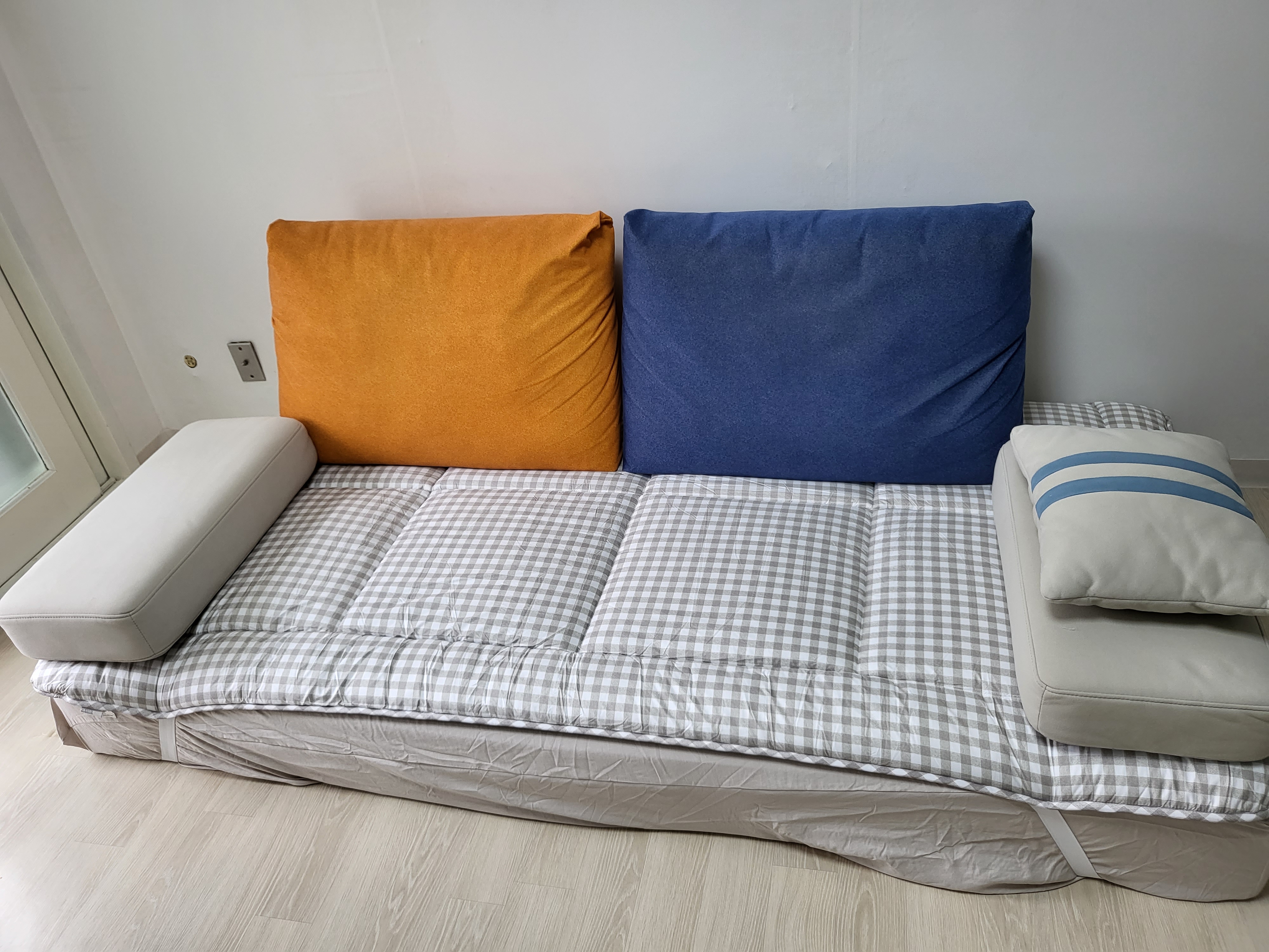 바로 패드를 깔았습니다. 미끄럼 방지 처리가 되어 있고 모서리 4면에 고무줄이 있어서 소파와 따로 놀 것 같지 않더라고요. 거의 침대 수준인데... 출산하고 나서 밤수유 때문에 따로 자게 되면 여기서 자면 되겠다 싶었습니다^^. 따로 토퍼나 매트리스를 사지 않아도 될 정도입니다.