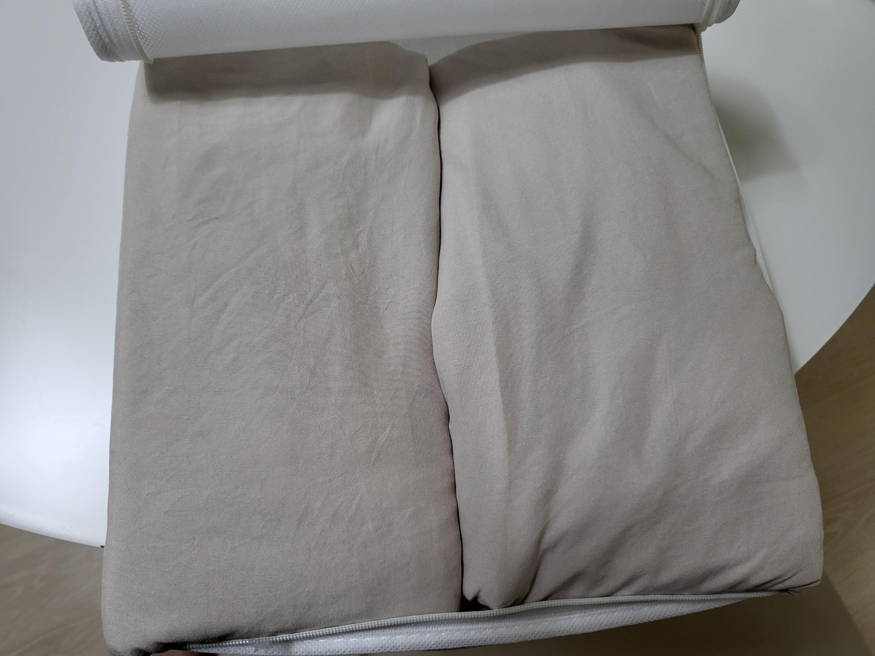 소프트워싱 매트리스 커버는 침대 커버 답게 되게 얇아요. 침대도 커버를 씌우고 패드를 씌우는데 딱 그 침대 커버입니다. 커버 색은 저희 집에 있는 소파와 비슷한 색으로 골랐습니다.