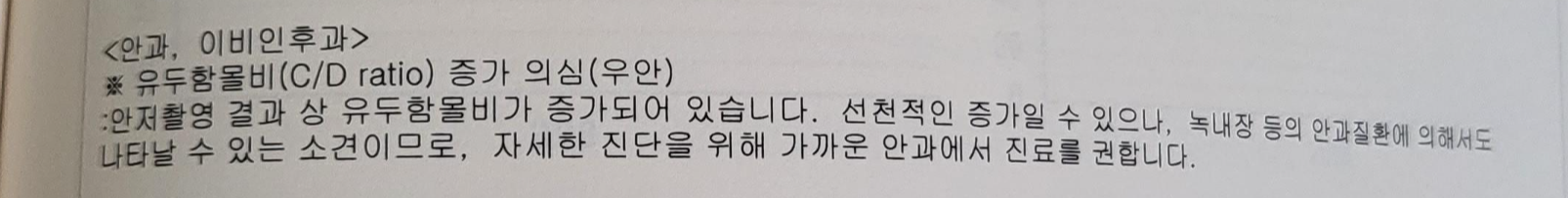 거의 4,5년 정도 매년 건강검진을 받고 있는데 안과에서 처음으로 이상 소견이 나왔더라고요.