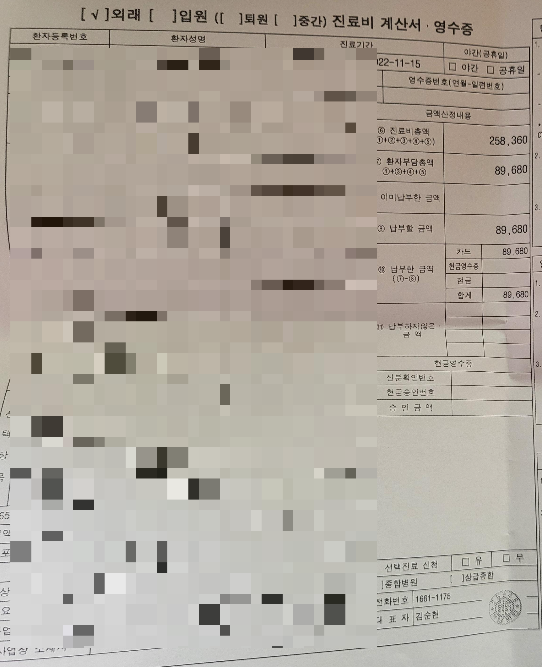 원래 녹내장 정밀검사는 13만원이라고 안내 받았는데, 임산부라서 외래 본인부담경감 할인이 적용되서 89,000원 정도 부담했어요. 가격대는 다른 병원보다 합리적인 편(어차피 실비 청구하지만..ㅎㅎ)인 것 같고 일단은 녹내장이 아니라고 하니 후련한 마음이었습니다. 저처럼 건강검진에서 유두함몰비 이상 소견을 받으신 분들은 동네병원보다는 처음부터 큰 병원에 가셔서 녹내장 정밀검진을 받는 걸 추천드려요! 병원에 두 번 발걸음 하는 게 참 번거로운 일이니까요.