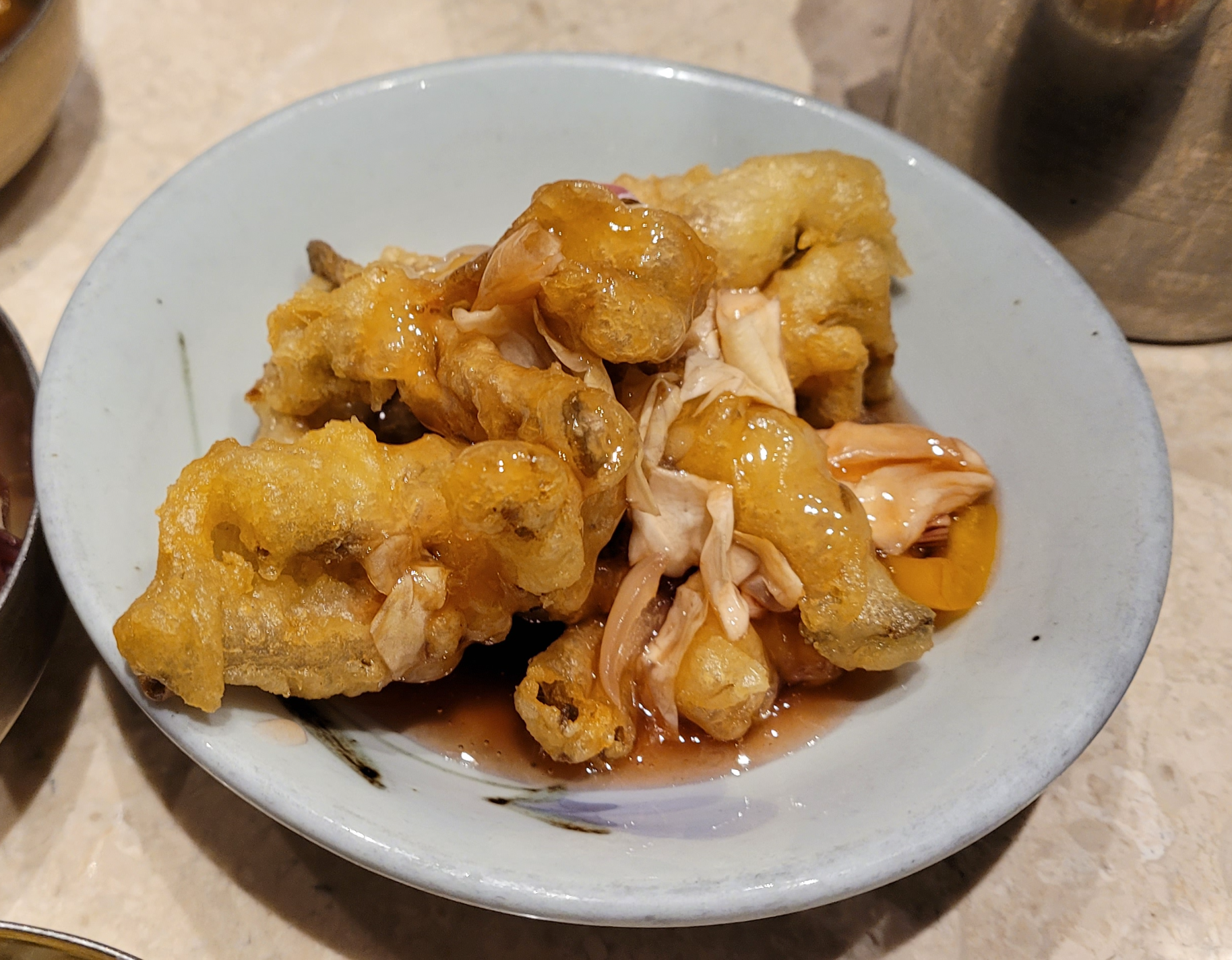 추가메뉴로는 소고기육전(15,000원), 곱창돌김(3,000원), 계란말이(6,000원)가 있는데 메인 메뉴만으로도 충분히 배부르기 때문에 추가메뉴 주문은 조금 더 고민해보시는 걸 추천합니다. 메인메뉴 반찬으로는 탕수육, 생선튀김, 왕새우장이 나오는데 리필을 할 경우에는 일정의 금액을 지불해야 합니다.