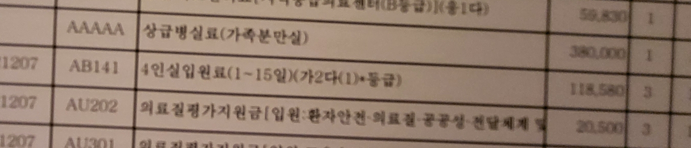 저는 4인실에 입원해있었고, 처치를 위해 가족분만실을 이용했는데 가족분만실도 상급병실료에 해당이 되더라고요..ㅠㅠㅠ남아있는 처치실이 음압실인 가족분만실 밖에 없어서 3시간 이용했는데 38만원이라는 거금이 들었습니다.