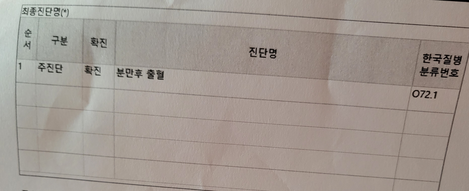 제 진단명은 분만후 출혈이었고 한국질병 분류번호로는 O72.1로, 일반 실비로는 보장이 안됩니다ㅠ.ㅠ 거의 대부분의 실손의료비는 임신, 출산과 관련된 질병은 보장이 안된다고 약관에 명시되어 있다고 해요..