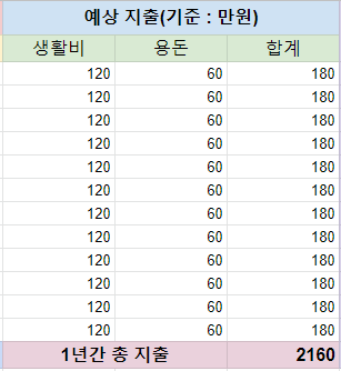 지금까지 각자 용돈 30만 원과 생활비 각각 60만 원으로 용돈 60만 원과 생활비 120만 원으로 생활해왔고요. 생활비에는 관리비, 식비는 물론 부모님 용돈과 여행비까지 충당했어요. 중간에 돈이 모자라서 투자금에서 200만 원을 뺀 적이 있으니 빠듯하긴 합니다. 아이를 낳으면 기저귀 값과 분유값이 추가로 들기 때문에 월 생활비 120만 원으로 가능할까 생각이 들지만 그때는 저희 용돈을 줄이든지 하면 되지 않을까 싶어 월평균 지출액은 180만 원으로 정했어요. 참고로 대출은 없어요.