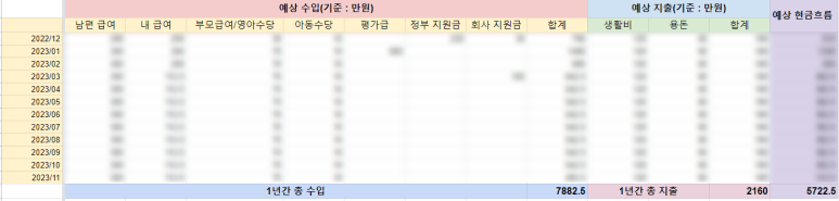 이를 토대로 정부 지원금(아동수당, 부모 급여, 첫 만남 지원금), 남편 월급, 제 육아휴직 급여 등을 고려해서 예상 현금흐름표를 만들어보았습니다. 회계 관점에서의 현금흐름표 개념과는 다르겠지만 수입(소득)에서 지출을 뺀 금액을 가용 가능한 현금의 흐름이라고 보고 예상 수입과 예상 지출을 계산했어요.