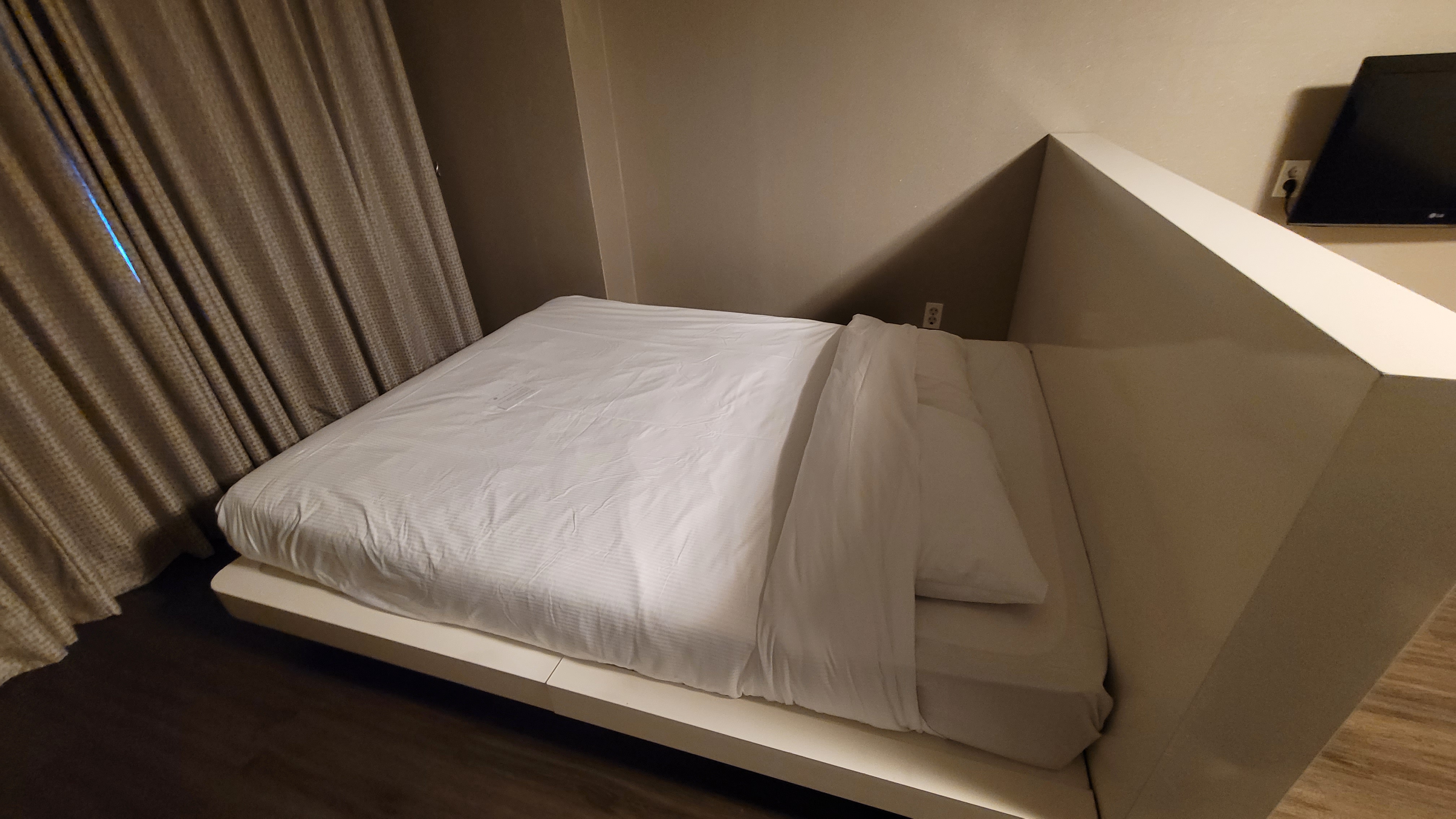 흰색 칸막이 안쪽에는 침대가 위치해있어요. 호텔식 침대, 집 침대보다 퀄리티가 떨어져서 잘 때 불편하긴 했습니다. 그래도 이 정도 가격이라면 충분히 감수할 만한 침대 퀄리티입니다.