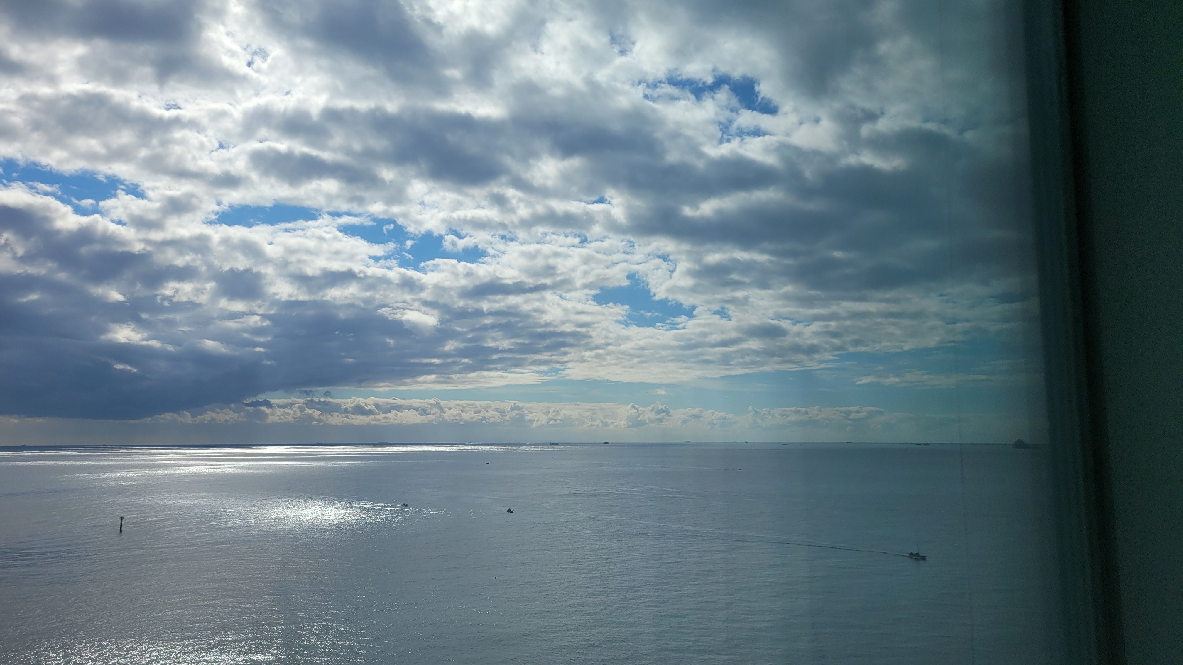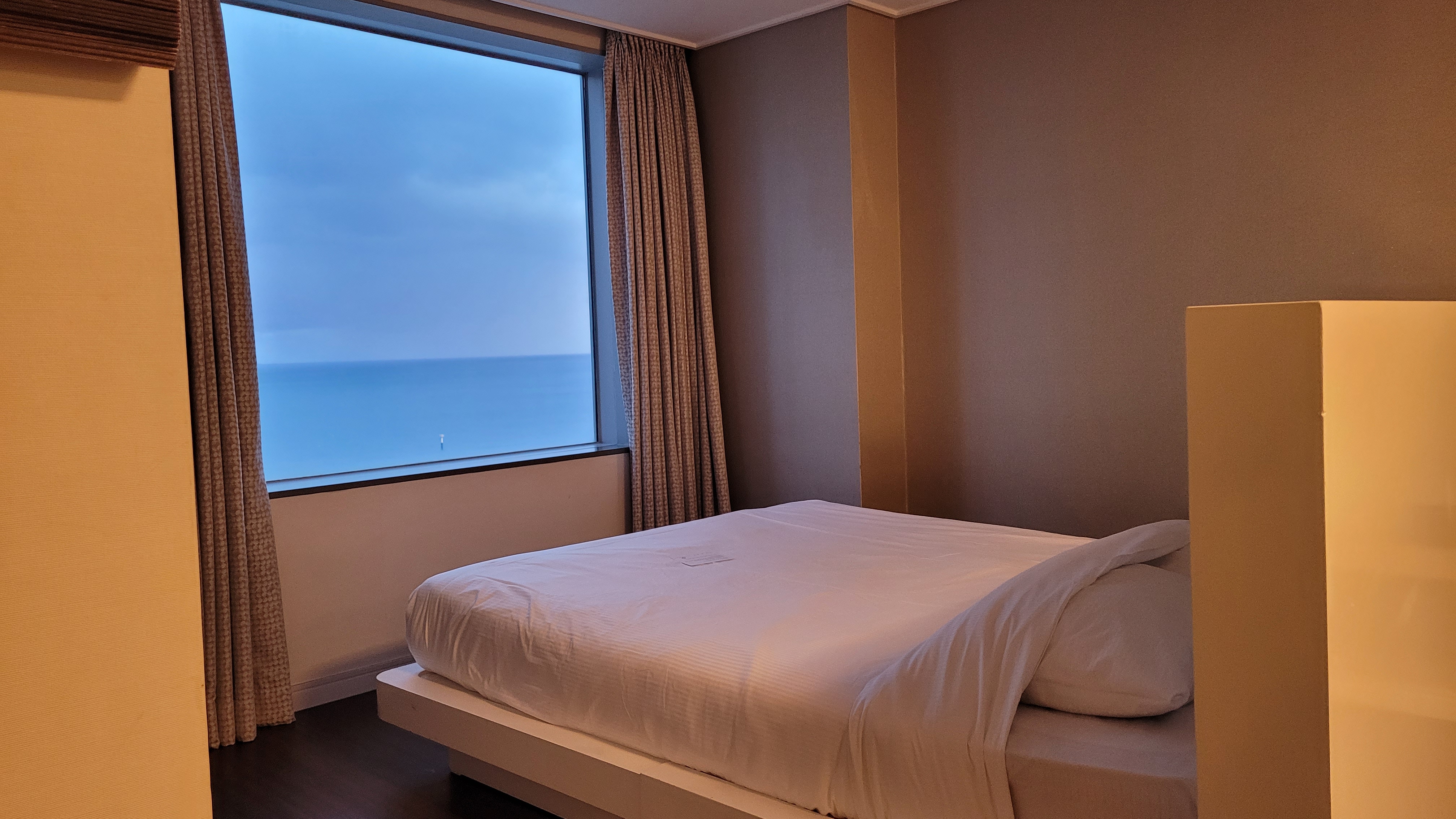 침대 바로 맞은편에 커튼이 있는데요. 커튼을 걷으면 앞에 빌딩이 있어요. 그래도 비스듬하게 바라보면 바다가 한 눈에 보입니다. 위 사진은 소파에서 찍은 사진인데 나름 감성 넘치는 사진이지 않나요? 마치 수채화를 그린 그림 액자처럼 분위기 있더라고요.