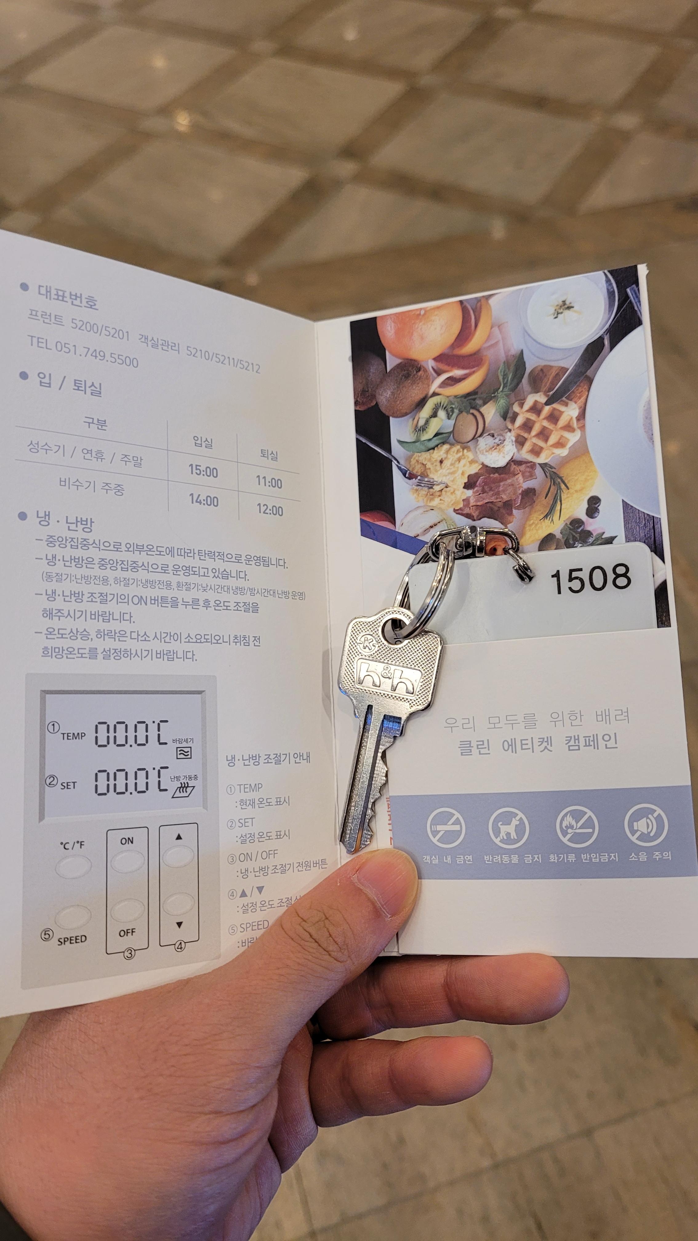 저희 부부가 배정받은 방은 15층에 위치해있었고요. 비수기 주중이어서 입실은 오후 2시, 퇴실은 12시였습니다. 키가 열쇠인 리조트는 정말 오랜만에 가보네요. 열쇠를 받으니 룸 내부도 연식이 느껴지지 않을까 걱정스러웠습니다.