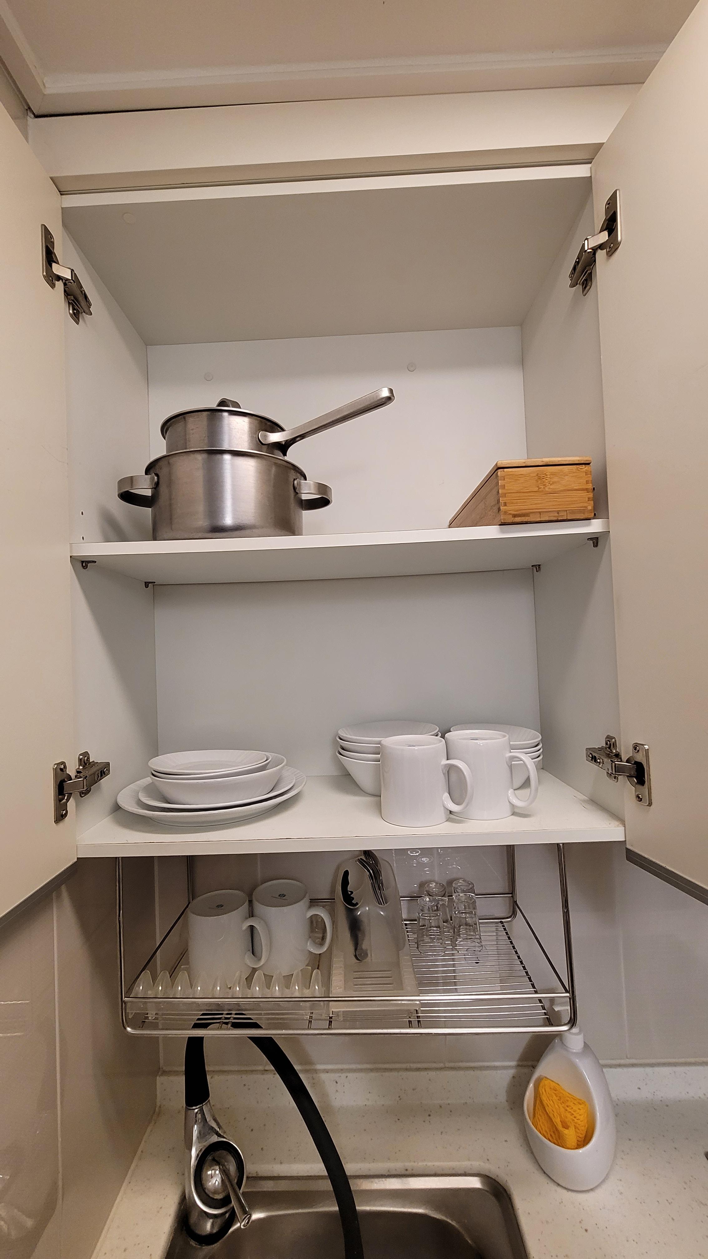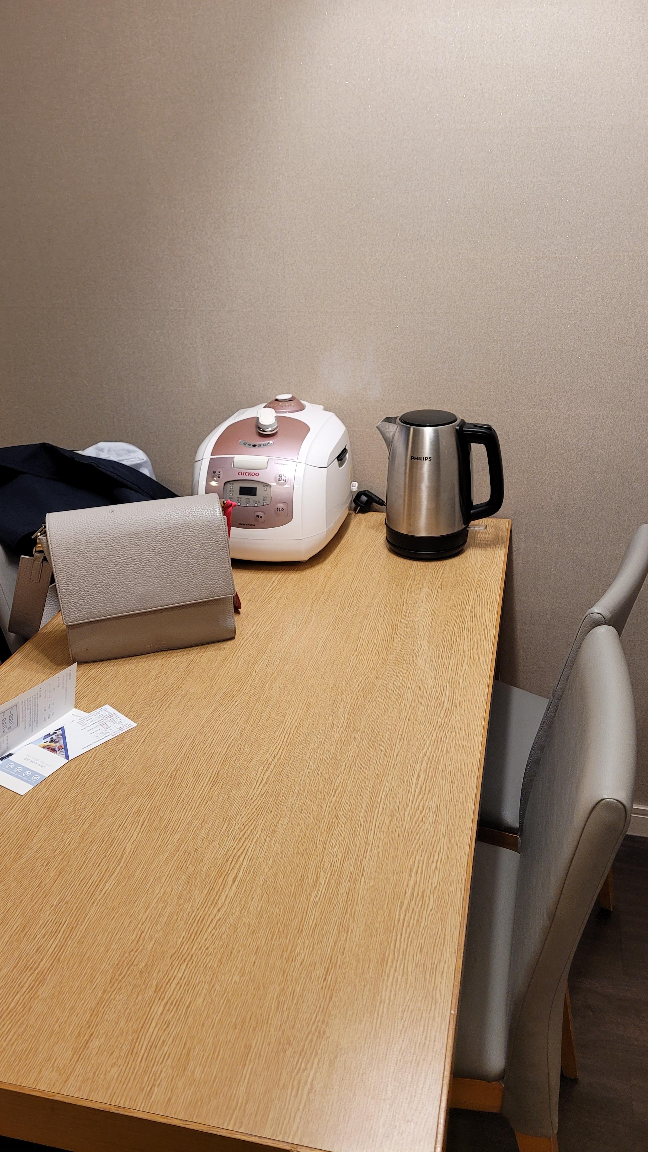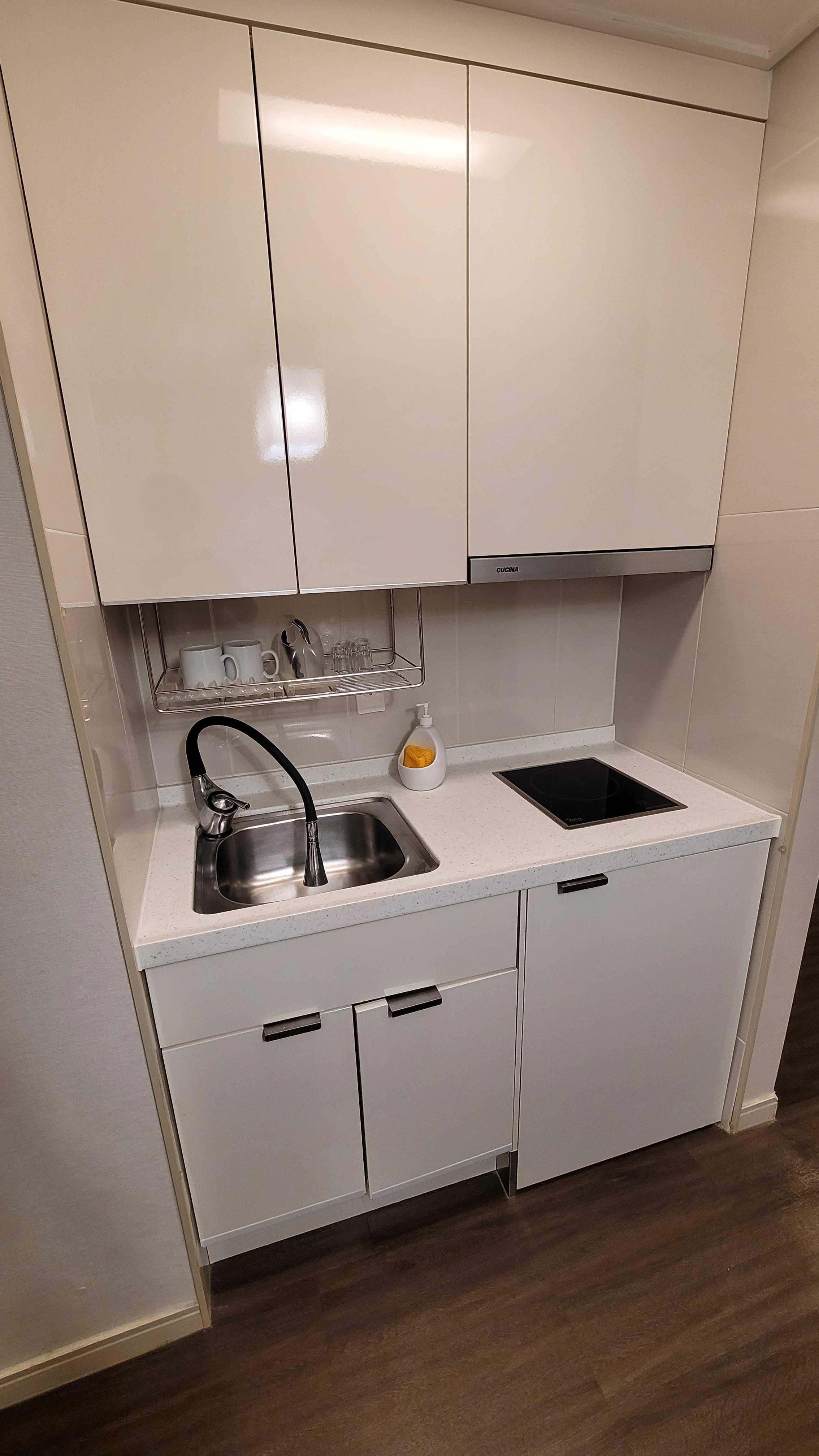 협소한 공간이지만 취사가 가능한 주방이 있어요. 1구 인덕션은 화력이 그닥 좋아보이진 않았습니다. 리조트 지하에 편의점이 있는데 편의점에서 과일, 과자 등 주전부리를 사서 접시에 덜어 먹는 정도로만 이용했어요. 1구 인덕션은 활용도가 떨어지기에 취사를 하실 분이면 아쉬울 것 같아요. 요리를 위해서는 최소 2구 정도는 필요하니까요.