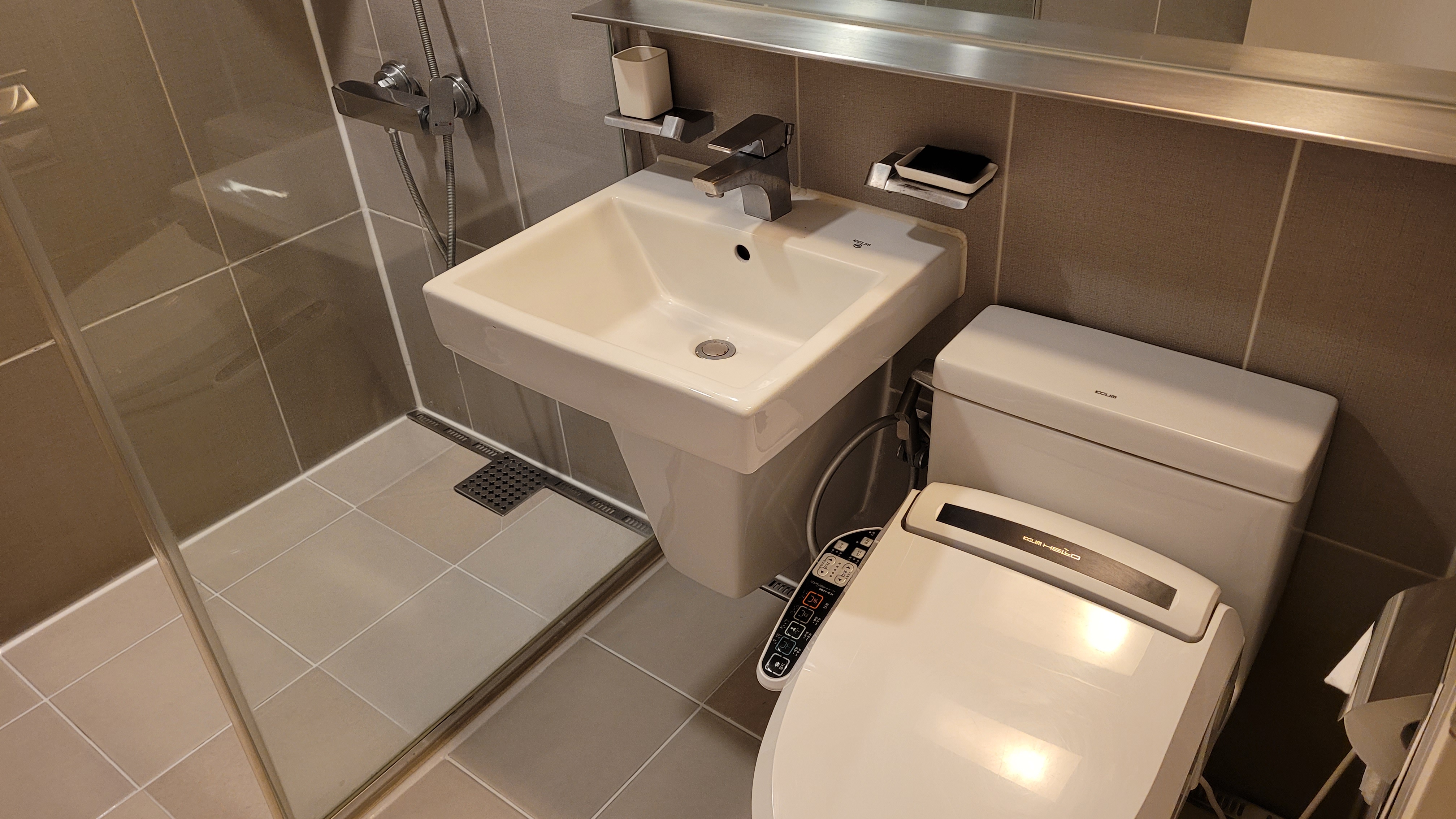 4인용 의자 위에 밥솥, 커피포트가 위치해있고요. 취사가 가능한 방이긴 했지만 식도락 여행이기도 했으니 이용하지 않았어요. 욕실은 면적은 좁지만 리모델링을 거친 것처럼 꽤나 깔끔했고요. 바디워시, 샴푸, 린스가 있어서 집에서 가져온 어메니티는 가방에 모셔두었습니다.