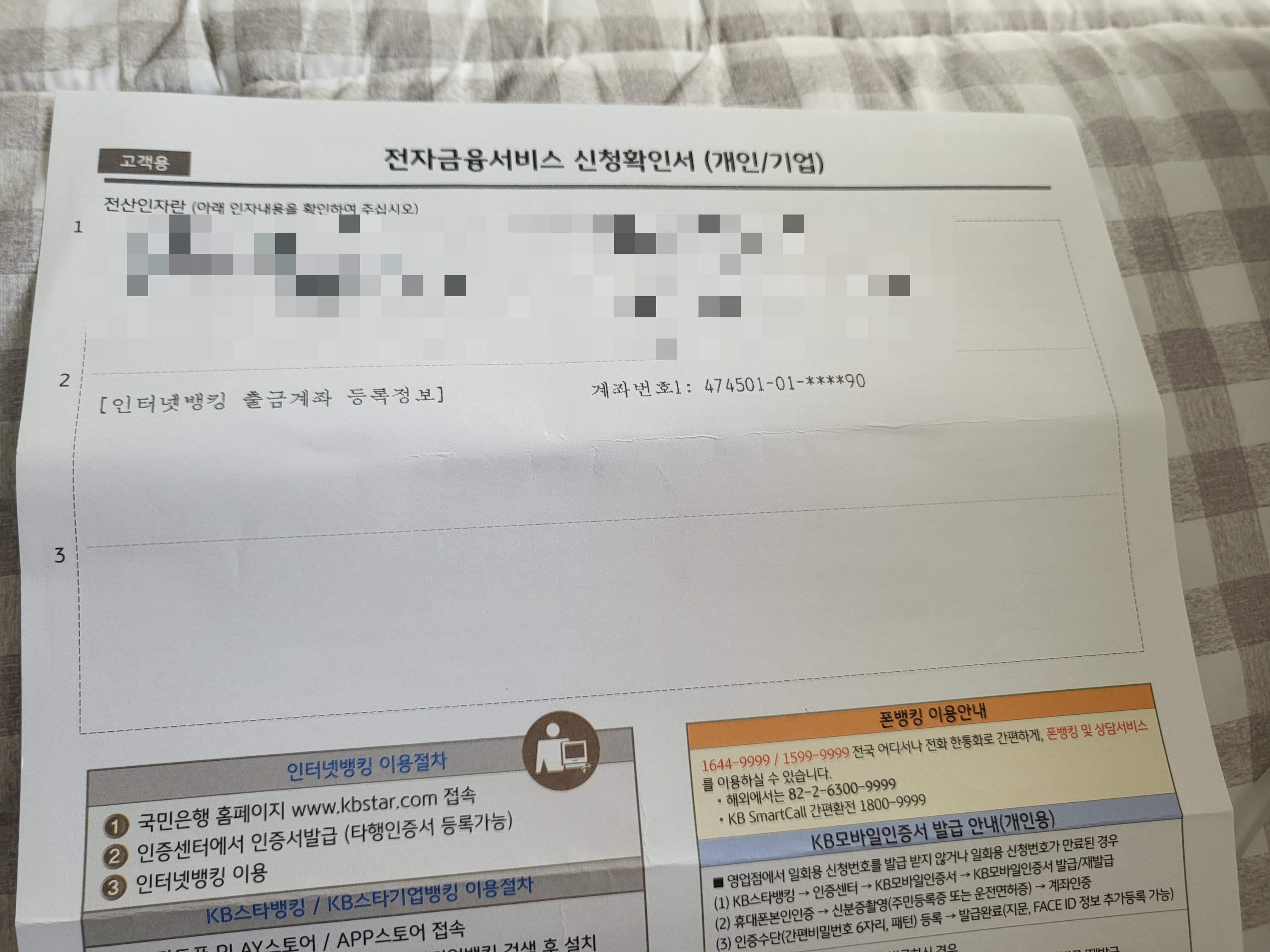 매일 은행에 가서 입금을 할 수는 없으니 인터넷뱅킹과 폰뱅킹을 신청했습니다. 접속을 위한 아이디를 지정했고 어플을 통해 공동인증서를 발급 받았어요. KB 모바일인증서를 발급 받아야 하나 싶었는데 KB 모바일인증서의 경우, 휴대폰 본인인증이 필요한 것 같아서 보안카드를 이용해 일반 공동인증서를 발급 받았습니다. OTP나 보안카드 없이 은행 거래가 가능한 요즘 시대에 보안카드를 받다니..미성년자 계좌라서 어쩔 수 없나 봅니다.