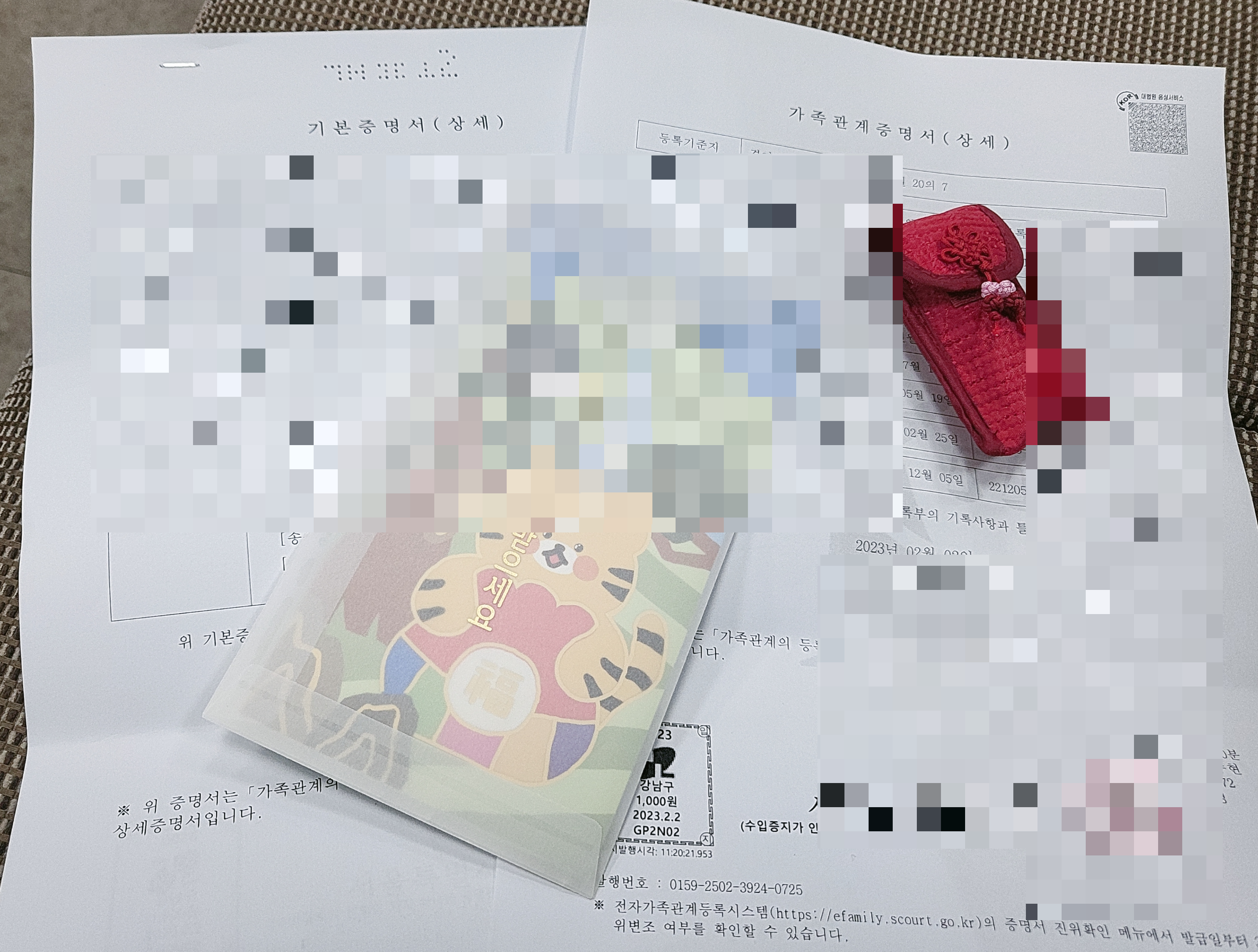 아기가 받은 첫 번째 용돈을 기념하기 위해 아기의 고모께서 주신 용돈을 가지고 왔어요. 아이 기본증명서(상세)는 무인민원발급기로는 발급이 불가하고, 주민 센터 창구에서 직접 발급받아야 합니다. 서류들은 업무를 마친 후에 다시 돌려받았습니다.