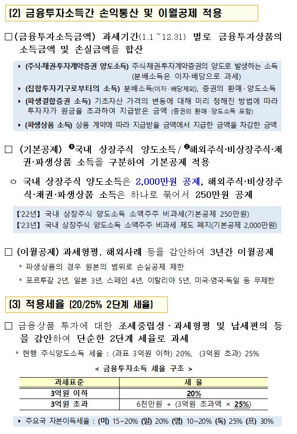 또한 과세기간 별로 소득금액 및 손실금액이 합산된다고 합니다. 예를 들면 A주식에서 이득을 보고 B주식에서 손실을 보았을 때 둘 금액이 합산되서 세금을 부과한다는 의미입니다. 3년간 이월공제도 된다고 하는데 이는 하단에 보도자료 내용을 참고하시어 자세히 알아보시기 바랍니다.