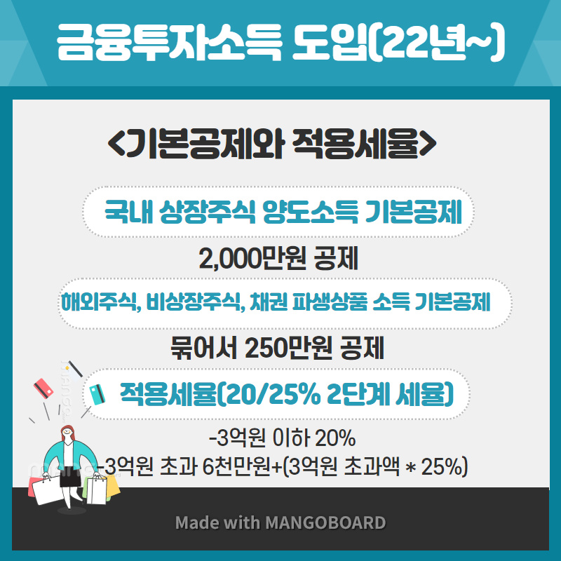 해외주식에 있었던 양도소득세가 이제 한국주식에도 부과됩니다. 우선 국내 상장주식 양도소득과 해외주식 비상장주식, 채권 파생상품 소득이 구분되서 기본공제가 되니 국내주식과 해외주식을 같이 하시는게 절세 측면에서는 유리하겠지요(물론 2,250만원의 이익이 난다는 전제 하에....).