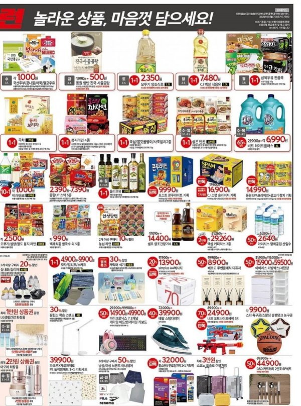 전단지 내 행사 가격을 살펴보니 충분히 합리적인 가격은 맞는 것 같아요. 인터넷 특가 정도의 가격을 오프라인으로 구매하는 정도랄까요? 다만, 필요없는 상품들을 세일한다고 구매하는 등의 하는 과한 소비는 자제하는 게 낫지 않을까 싶어요. 지난 번 쓱데이 행사에서 찹쌀호떡믹스를 1+1 한다고 구매했다가 한 개만 만들어 먹은 기억이 나거든요. 1+1보다 50% 세일이 좋은데 대부분 1+1 행사인 것은 아쉽긴 합니다. 그래도 품목이 다양하니 필요한 상품들이 있으시다면 홈플러스 홈플런에서 장바구니 물가를 줄여보시길 바라겠습니다^^