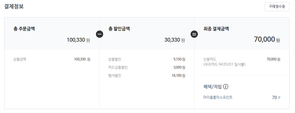 홈플러스 앱에서 홈플런 기간 중 7만원 이상 결제를 하면 5,000원 쿠폰을 준다길래 체감가는 65,000원이에요. 딱 7만원을 맞출 생각은 없었는데 어떻게 딱 7만원이 맞춰졌네요.