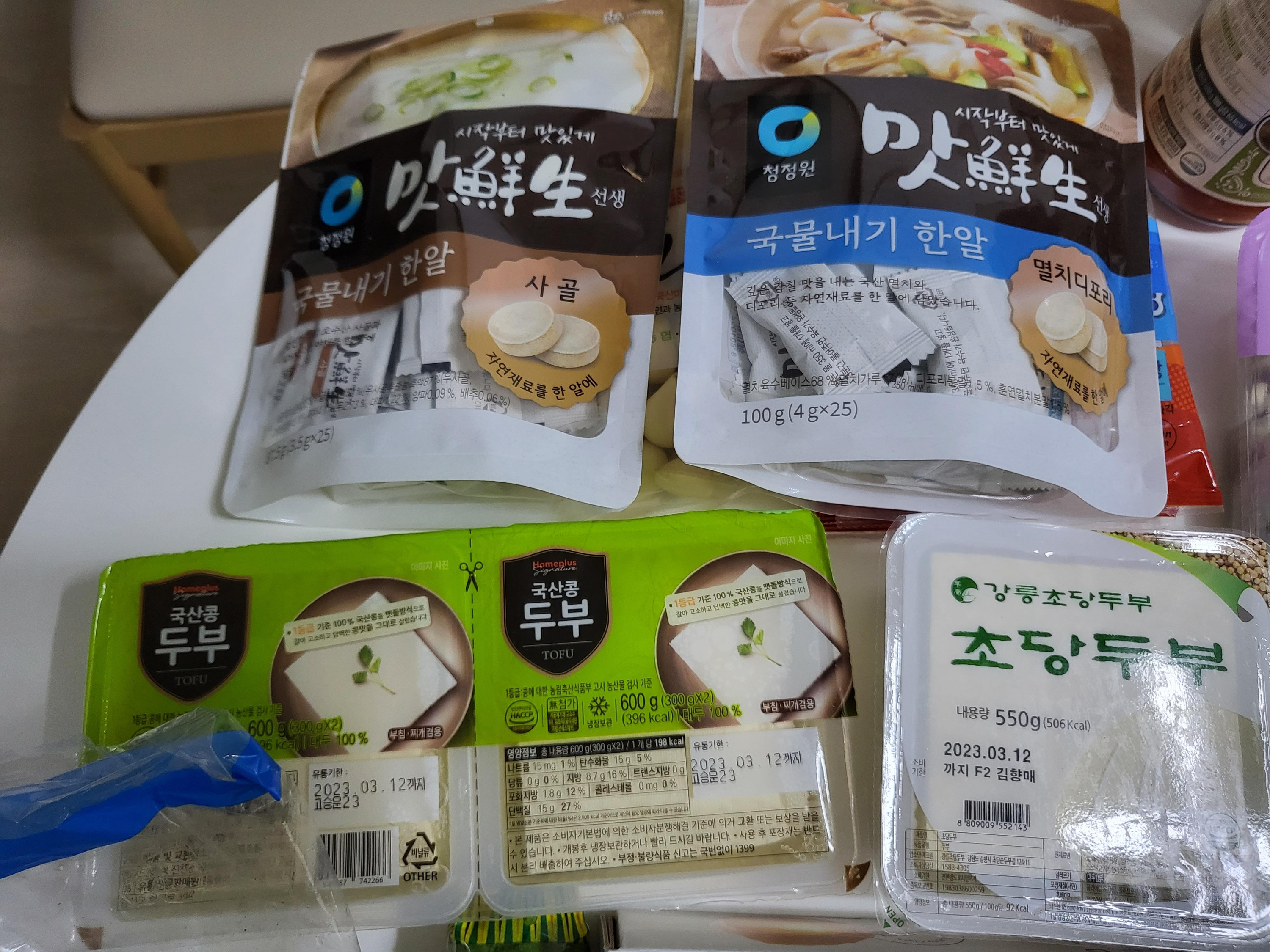 코인육수가 1+1 행사하길래 구입했어요. 결혼 후 지금까지 멸치, 다시마 육수를 직접 내었는데 음식물 쓰레기가 많이 나와서 코인육수로 갈아타렵니다. 아직 먹어보진 않았는데 맛있겠죠..?ㅎㅎ 두부도 요긴하게 사용하니 많이 주문했는데 강릉초당두부라고 불리는 두부는 사기당했습니다. 강릉두부인 줄 알았는데 외국산 콩으로 만든 두부더라고요...강릉은 앞에 왜 붙였는지 다음부터 절대 안 살 예정이에요.