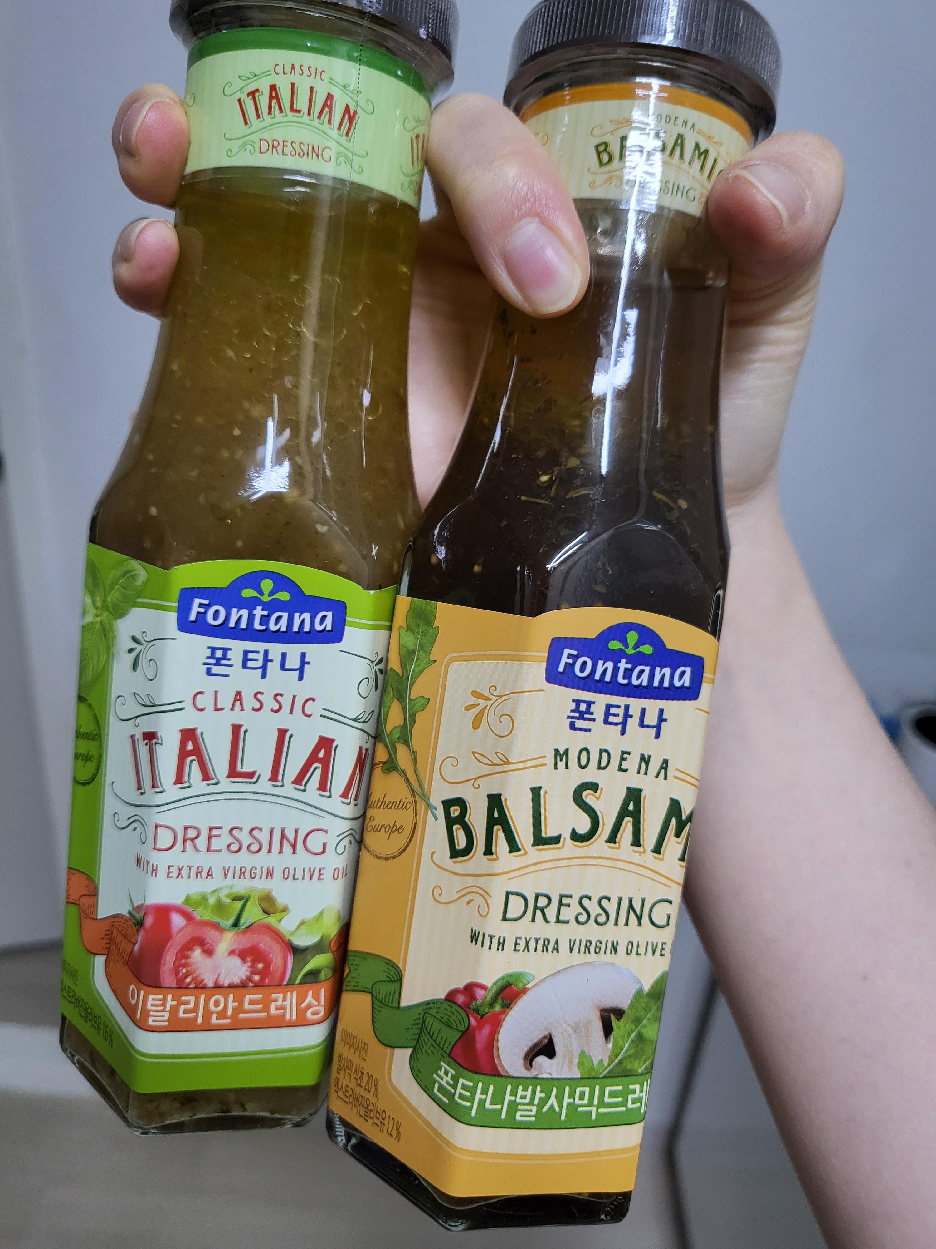 파스타를 만들 때 폰타나 제품들을 선호하는 편이라 샐러드 드레싱으로 폰타나 제품을 구매해보았습니다. 1+1 행사 상품이라 저렴하게 구입했는데요. 육아하느라 지방을 축적하고 있는 남편을 위해... 저칼로리 드레싱인 이탈리안 드레싱, 발사믹 드레싱 두 가지를 골랐고요.