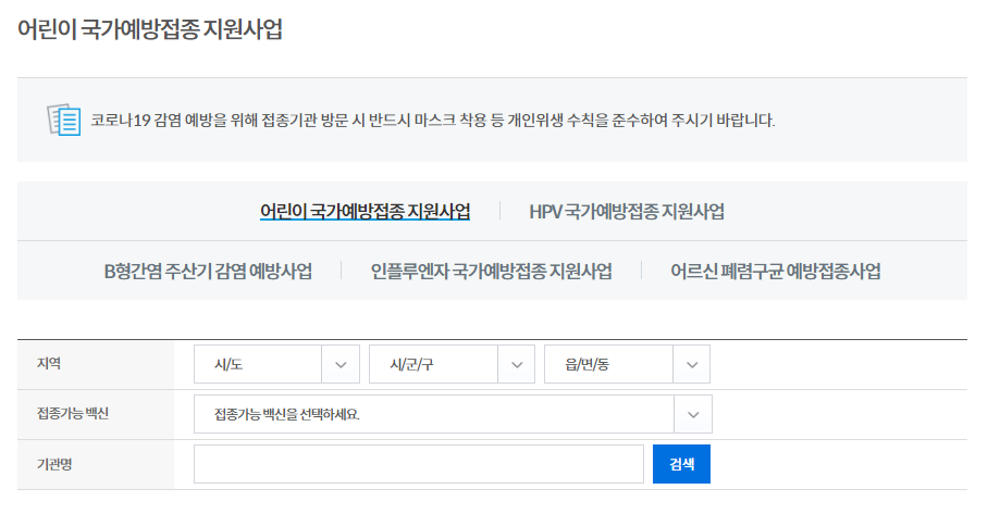 로타바이러스 접종 가능한 병원은 예방접종도우미 사이트를 참고하시면 되는데요. '예방접종 관리>지정의료기관 찾기>어린이 국가예방접종 지원사업' 순서로 클릭하시면 하단의 화면을 확인하실 수 있습니다.