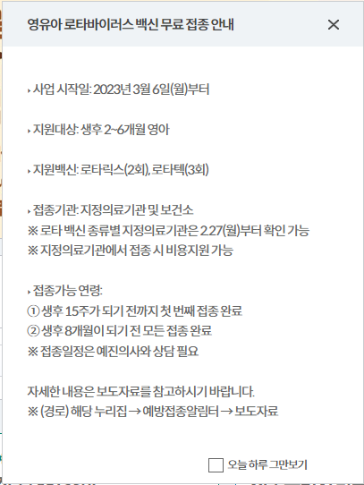 2023년 3월 6일부터 영유아 대상으로 한 로타바이러스 예방접종이 무료로 전환되었는데요. 1차 접종기한이 얼마 남지 않아서 무료로 전환된 6일에 접종을 하러 병원에 다녀왔어요. 아기가 다니는 병원에서 로타바이러스는 접종 시기가 정해져있기 때문에 최대한 빨리 1차 접종을 시작하자고 하셨거든요. 만약에 접종 시기 내에 감기라도 걸리면 마지막 접종이 연기될 수 있고, 그렇게 되면 접종을 마무리하지 못한다고 합니다.