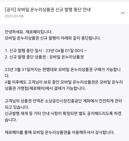 비플제로페이의 모바일 온누리상품권 신규 발행 중단 소식