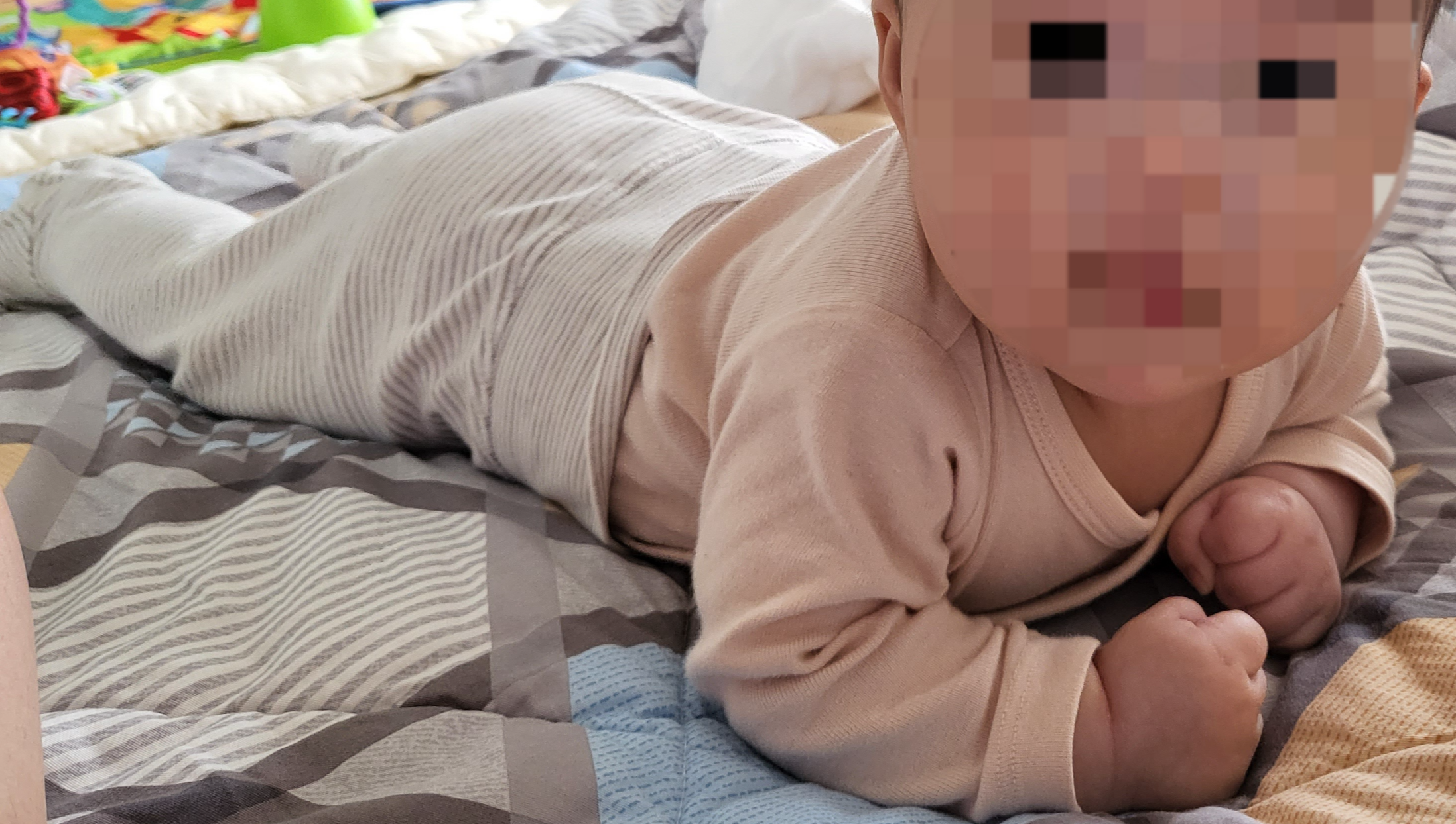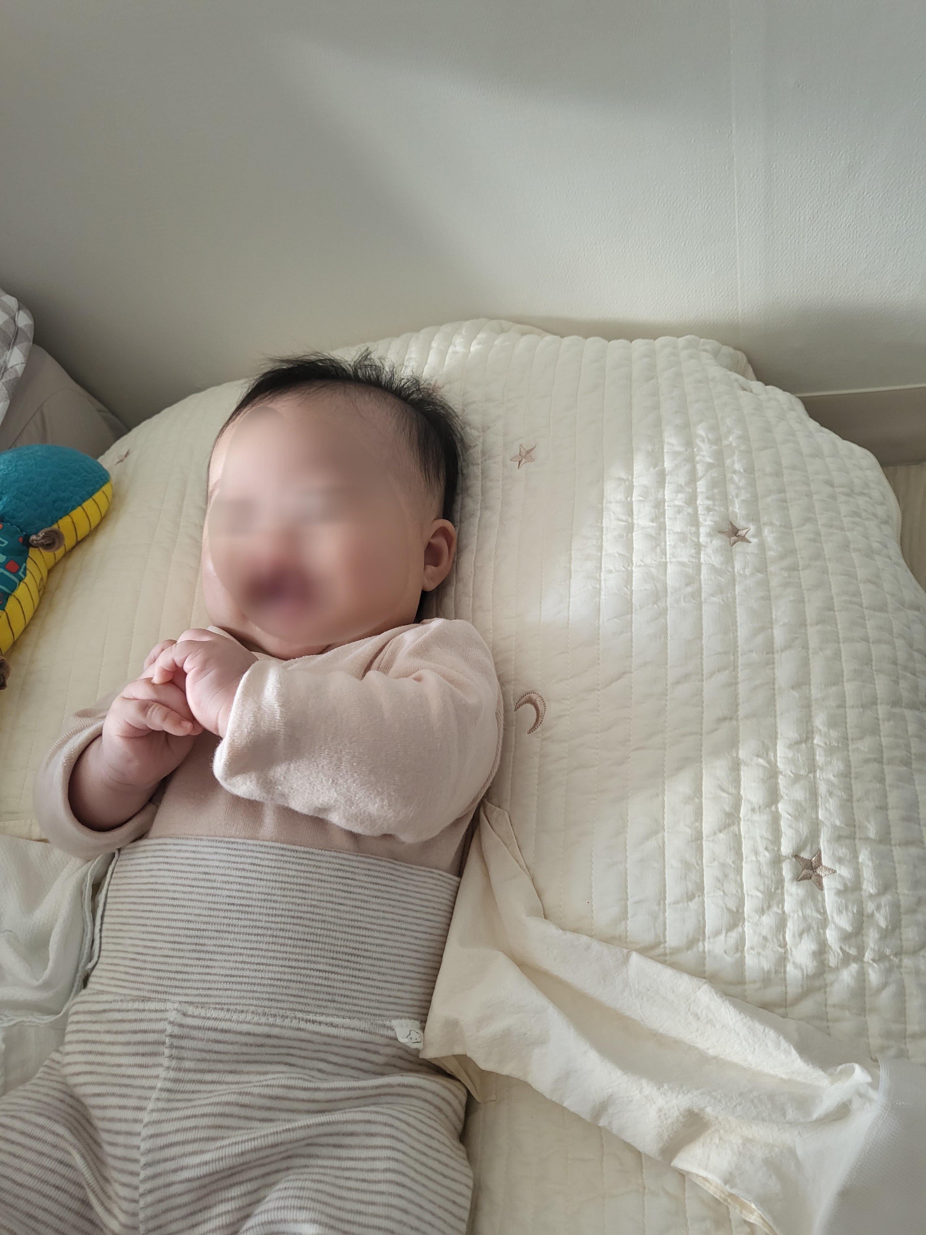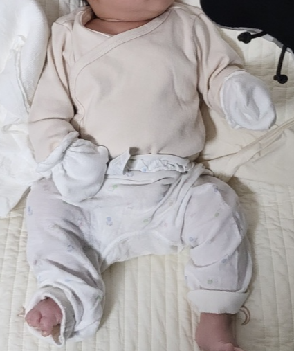 96일차 아기 터미타임할 때 찍은 사진인데 바지가 크지 않고 잘 맞죠~?ㅎㅎ 이 바지의 장점 중 하나가 양말을 따로 신기지 않아도 된다는 점인데요. 수족냉증이 있어서 발이 조금 차가울 때가 있는데 일체형 바지라서 발싸개도 안 해도 되고 편하답니다. 발싸개는 잘 빠지고, 양말은 꽉 끼거든요. 바지를 사신다면 이런 일체형 바지도 한,두 벌 구입하시는 걸 추천드려요.