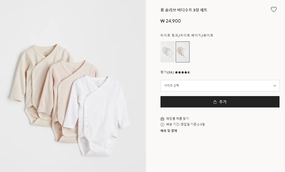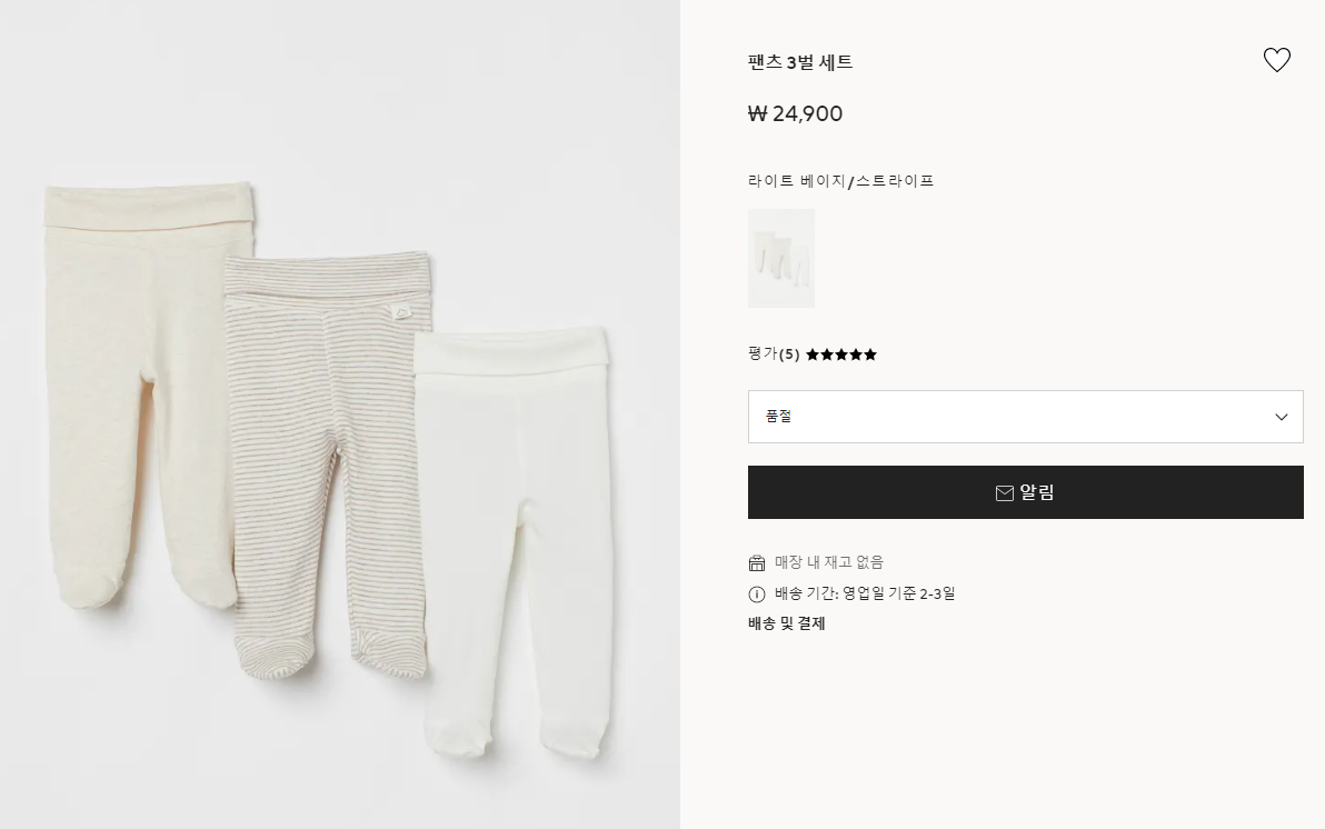 출산 전 준비했던 의류는 배넷저고리, 바디수트가 전부였는데 알고 보니 바지도 몇 벌 필요하더라고요. H&M에 급하게 접속해서 바지를 살펴보는데 운이 좋게 2-4M 사이즈의 바지가 있어 바로 구입했어요. 오후 6시가 다 되가는 시간에 주문했는데 다음 날 바로 배송 되서 놀랐던 기억이 있어요. 3벌에 24,900원인데 가격대도 합리적이고 디자인도 예뻐요.