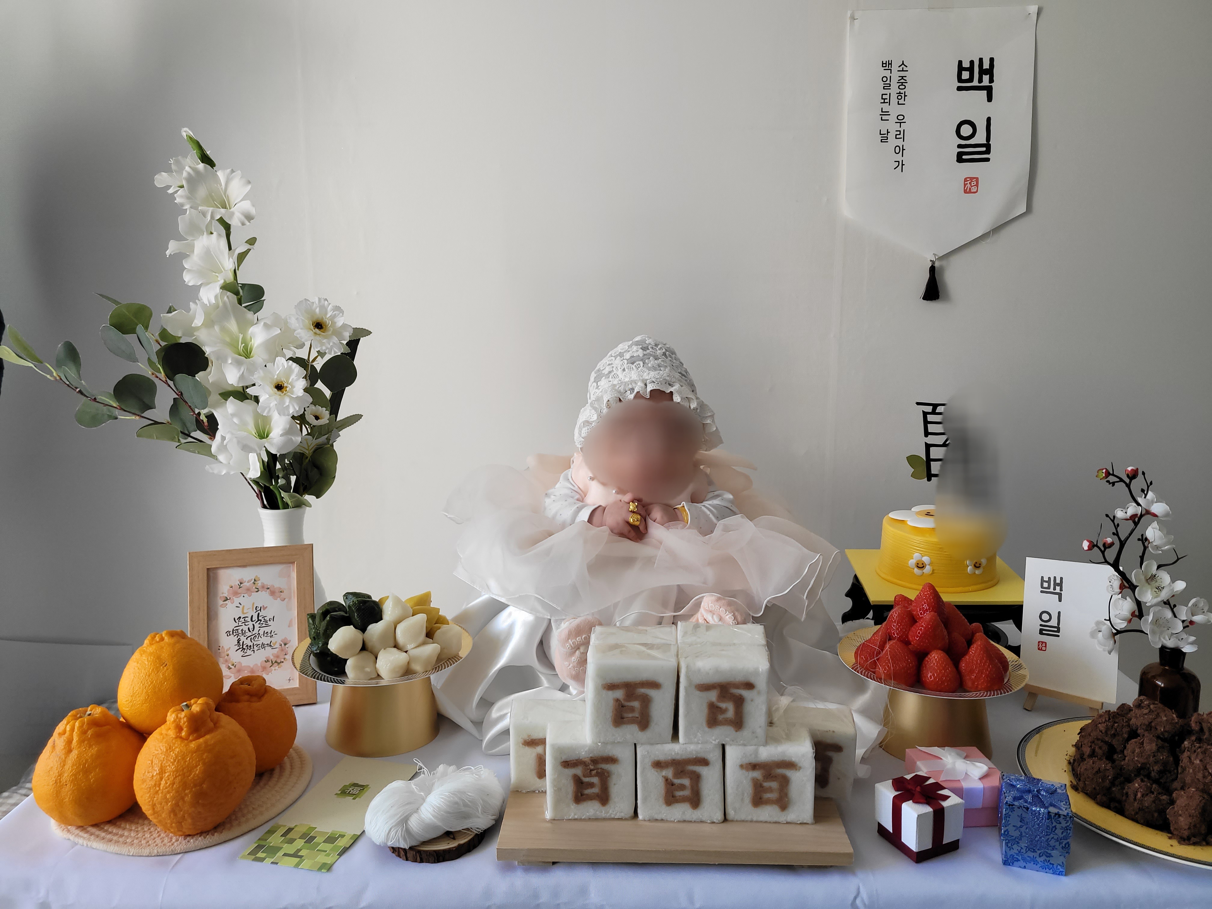 아기의 백일을 맞이하기 전에 백일상을 할까 말까 고민을 굉장히 많이 했는데요. 오래전 의학이 발달하기 전에는 백일 잔치를 했지만 요즘은 백일 잔치는 생략하는 추세이기 때문입니다. 백일에는 스튜디오에 가서 사진을 찍어 줄까 하여 백일 사진은 예약을 해뒀는데 알고보니 백일 사진을 백일에 딱 찍는 게 아니더라고요. 사진관에서 목을 완전히 가눌 120~130일 정도에 오라고 해서 백일날의 스케줄은 비어있었죠. 이왕 이렇게 되었으니 집에서 셀프 백일상을 차리기로 했어요.