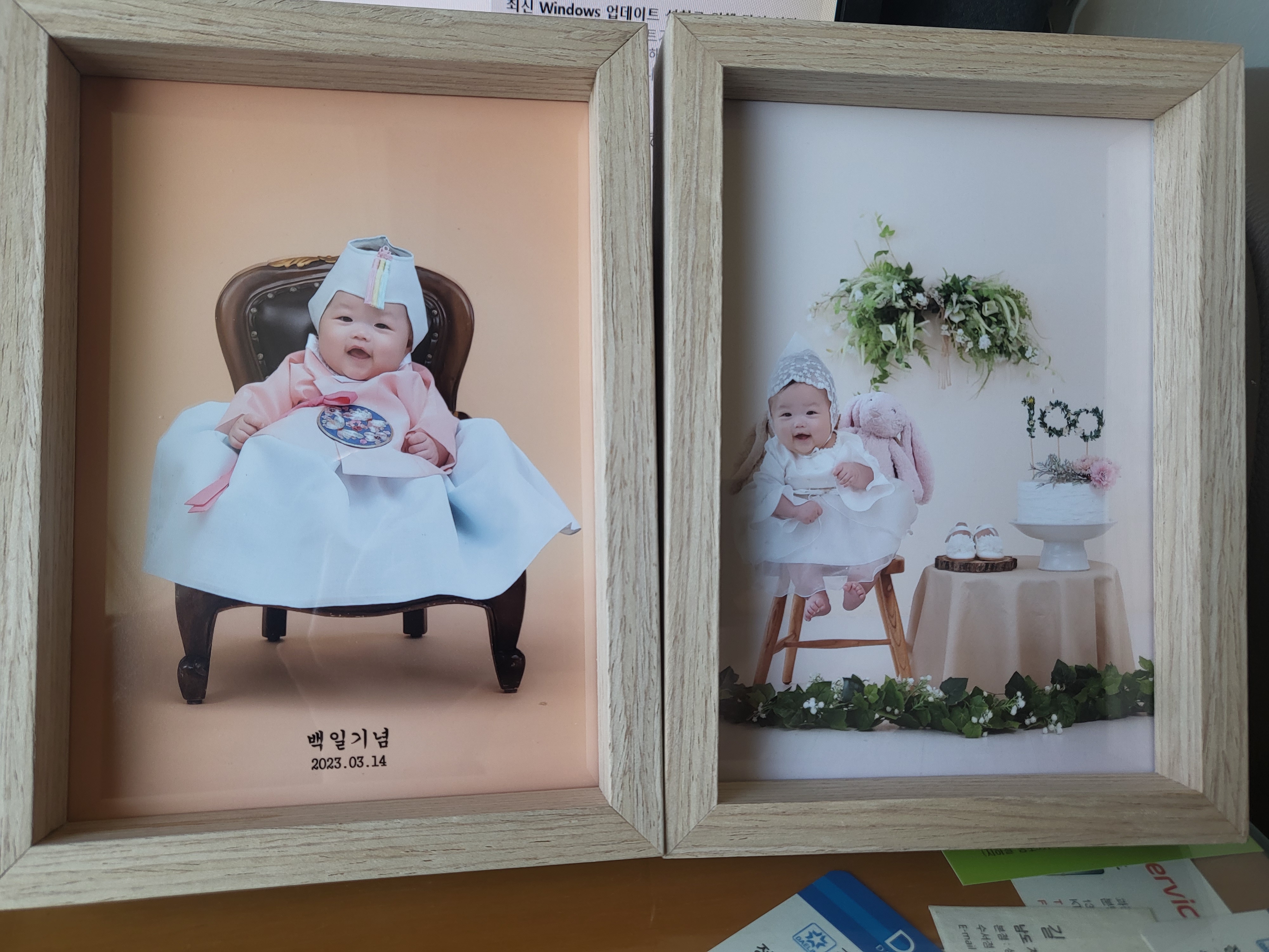 촬영에 대략 10~15분 정도 소요되었고, 한 컨셉 당, 한 개의 액자를 주시기 때문에 액자에 담을 사진을 위해 두 장을 셀렉했어요. 액자용 사진은 수정을 해주시고 그 외 원본은 블로그, 카페에 후기를 남기면 무료로 제공해주십니다. 아가가 다행히 몇 초 웃어주어서 웃음 가득한 사진을 셀렉할 수 있었네요. 수정, 출력은 별도로 15분 정도 걸려서 거의 1시간 꽉채워 다음 타임 분들도 마주쳤어요ㅎㅎ