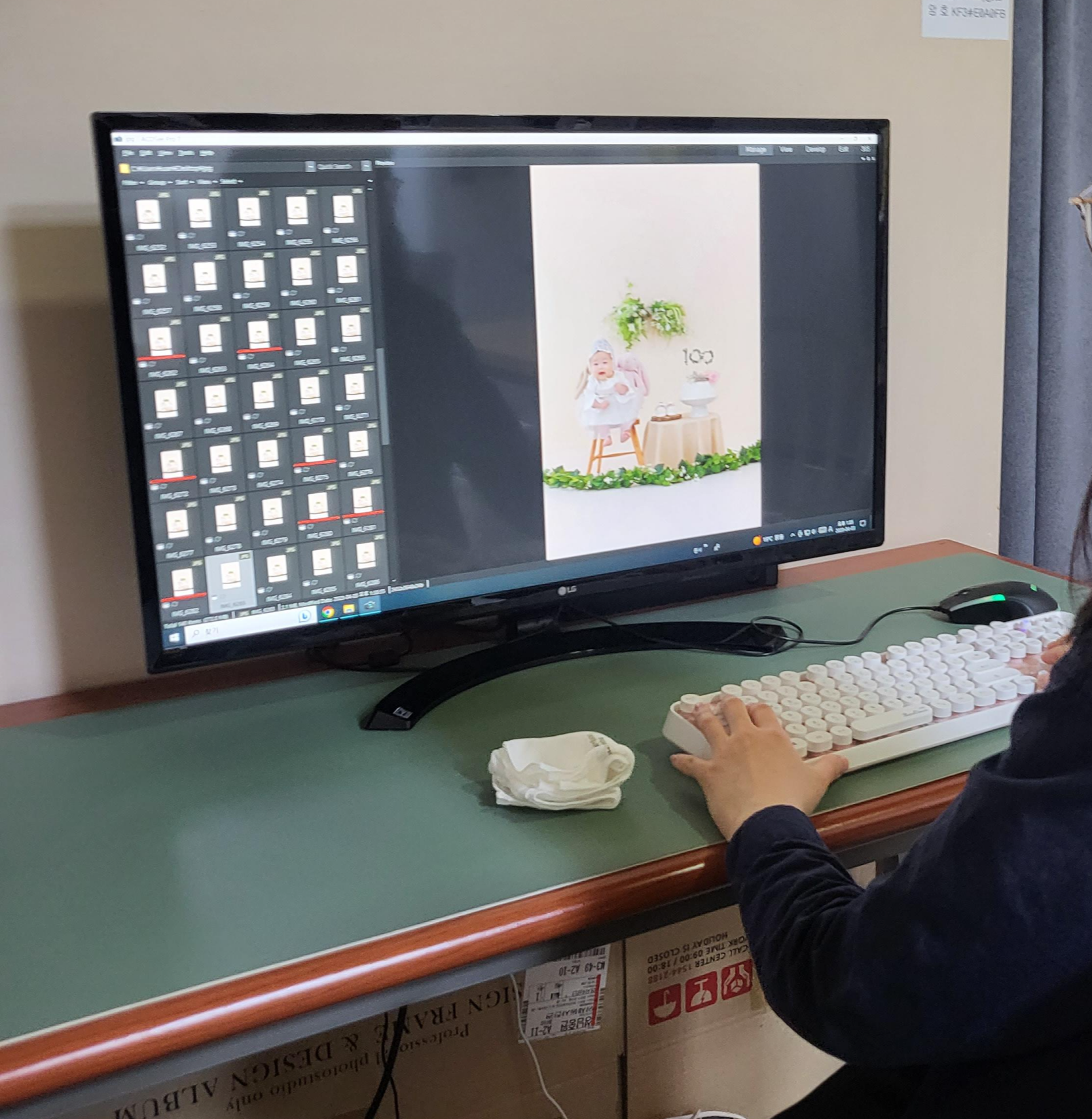 저희가 살짝 지각을 하는 바람에 도착하자마자 서둘러 촬영 준비를 했는데요. 아이패드로 사진 샘플을 둘러본 후 백일 사진 컨셉을 선택했어요. 한 컨셉당 5만원으로, 저희 부부는 두 가지 컨셉을 골랐답니다 옷은 무료로 대여 가능한데 두 가지 컨셉이니 두 벌을 골랐어요. 이 곳 양재동사진관은 백일사진, 돌사진 전문인데 돌사진 의상이 70%, 백일사진 의상이 30% 정도 되는 듯 했어요. 한복 퀄리티는 무난하고, 일반 외출복들은 연식이 있는데 사진으로는 티가 나지 않을 것 같긴 합니다. 환복은 도와주시는 분이 없어서 혼자 가시면 힘들 수 있어요. 작가님 보조해주시는 직원분이 있으시지만 환복은 저희의 몫!