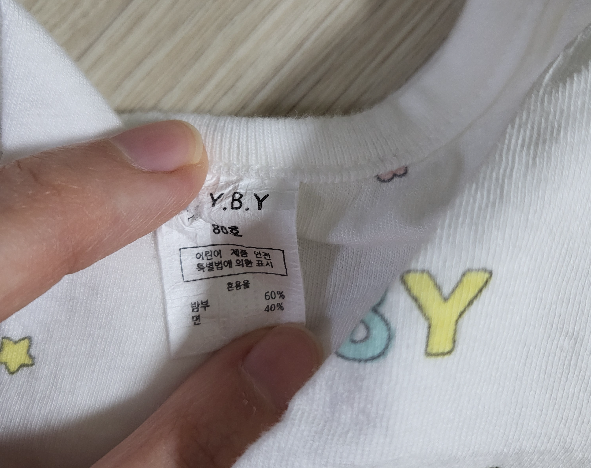 밤부 소재라서 그런지 '건조기 사용 금지'라고 택에 적혀 있지만 건조기 러버인 저는 맘껏 건조기를 돌립니다ㅋㅋㅋ살짝 쭈글거리지만 어차피 한 철 입히면 작아져서 못 입기 때문에 합리화를 해봅니다. 혼용율은 밤부 60%, 면 40%로 밤부 소재의 비율이 좀 더 높습니다. 손수건을 이용해보더라도 밤부 소재면 확실히 보들보들한 감이 있어요. 때문에 내의도 면 100% 내의보다는 뻣뻣한 감이 덜할 것 같아요. 아, 그리고 밤부 소재라서 면이 흐물흐물한데 금방 헤질 것 같은 느낌은 있습니다ㅠ_ㅠ