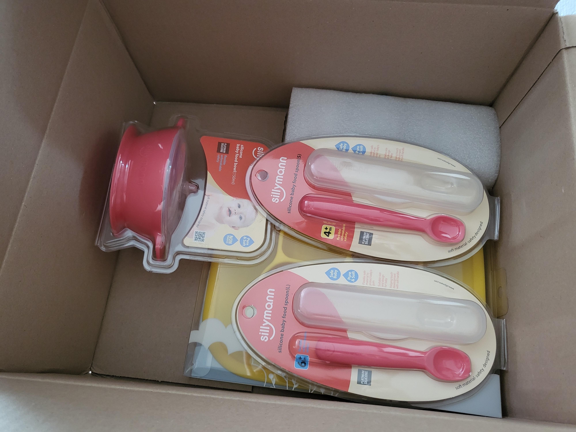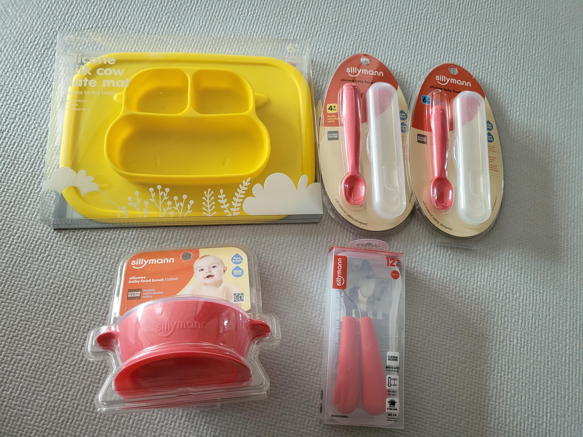 제가 실리만에서 구입한 제품은 흡착식판, 이유식 용기, 스푼(소), 스푼(대), 수저세트입니다. 요즘 유행하는 파스텔톤, 베이지색의 느낌은 안나지만 아기들이 좋아할 만한 귀여운 색감이에요. 실제로 보면 더 귀여운데 사진으로는 잘 안 담기네요.