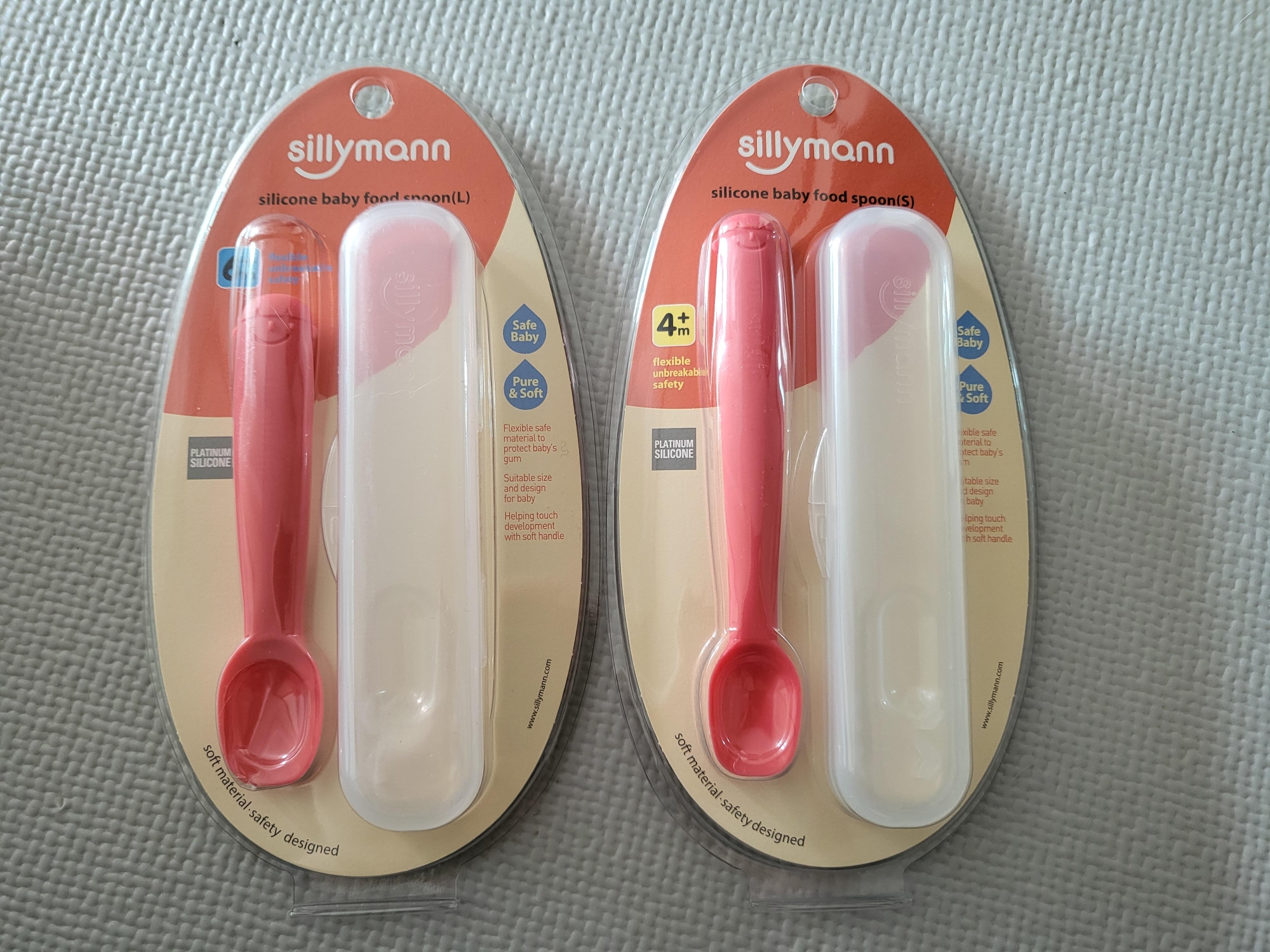이유식 스푼 소, 대 사이즈입니다. 오른쪽이 작은 사이즈 스푼이고, 왼쪽이 큰 사이즈 스푼인데요. 손잡이는 오른쪽이 길지만 용량이 작은 편이에요. 작은 사이즈는 4개월 이후부터 사용 가능하고, 큰 사이즈는 6개월 이후부터 사용 가능하다는데 그냥 큰 사이즈 두 개를 살 걸 그랬나 살짝 후회됩니다. 어차피 6개월부터 이유식을 시작할 예정이었거든요. 아 그리고 실리만 스푼은 휴대용 케이스가 있어서 외출할 때 편할 것 같습니다.