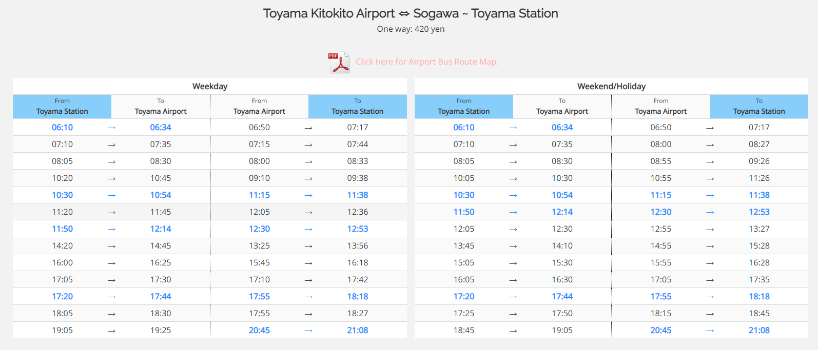 상단의 시간표는 도야마 공항에서 시내를 오가는 버스 시간표입니다. 아시아나 항공 기준으로 리무진 시간이 엉망이라서 귀국편을 탈 때는 일찍 와야했어요. 10~15분 타는데 택시비가 4만원이라서 부담스럽더라고요. 버스 편도는 420엔인데 공항리무진 버스라기 보다는 현지 버스를 이용하는 것 같았어요. 시간표 내에 파란색 표시만 리무진인 듯 싶었습니다.