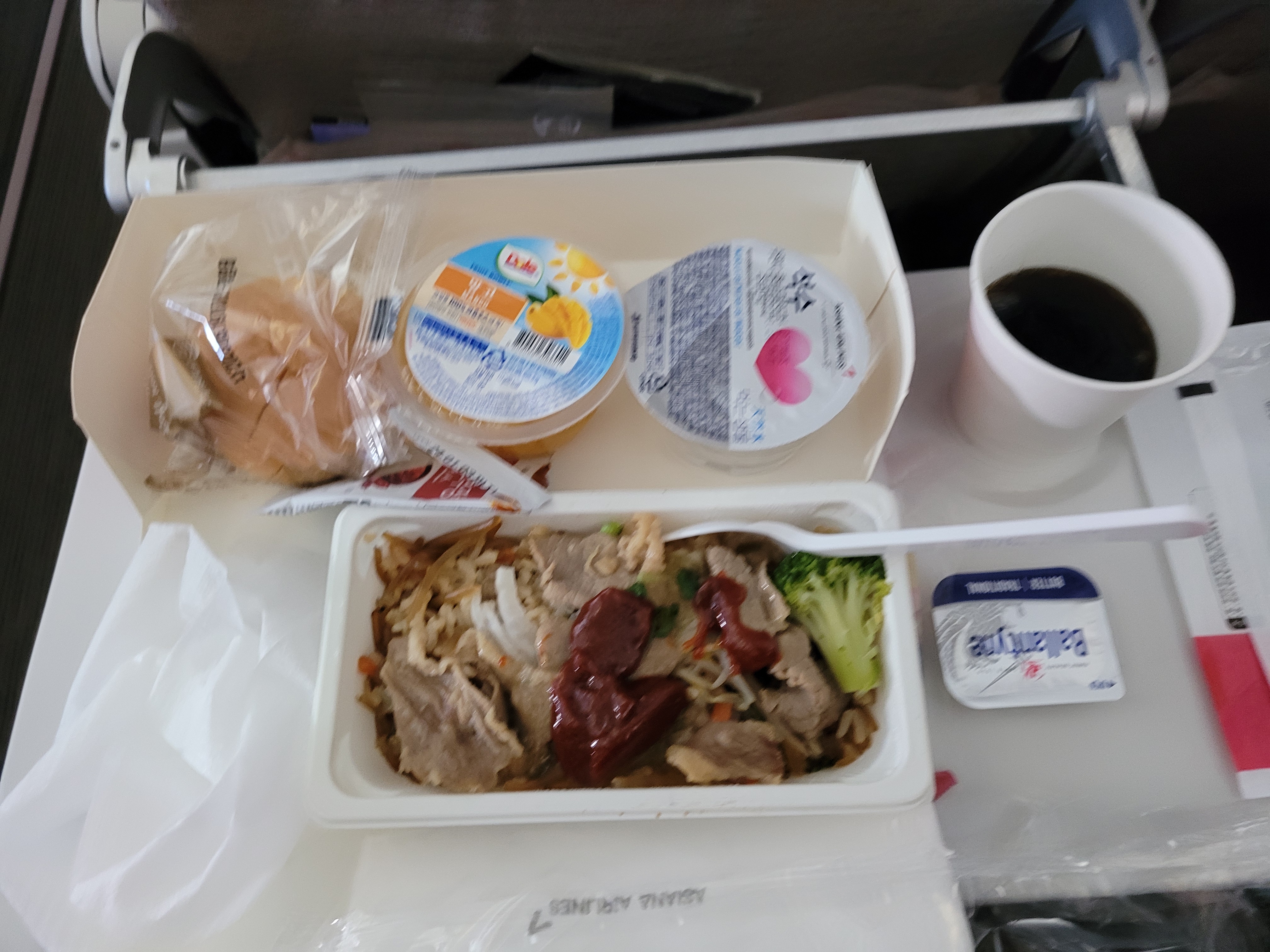 2시간 남짓의 짧은 이동 시간에도 불구하고 아시아나 항공이라서 그런지 기내식을 제공해주더라고요. 사실 최근에 아시아나항공이 기내식 관련 이슈가 있기도 해서 큰 기대는 안했는데 정말 맛있었어요. 출국 시에는 잡채밥이 나왔는데 간도 꽤나 적절하고 볶음 고추장을 조금 넣어 비벼먹으니 환상적인 맛이었습니다. 공복에 먹어서 더 맛있었을 수도 있고요. 기내식에는 생수도 포함되어 있으니 음료 서비스로는 생수 이외에 다른 음료를 선택하시는 것이 좋을 것 같습니다.