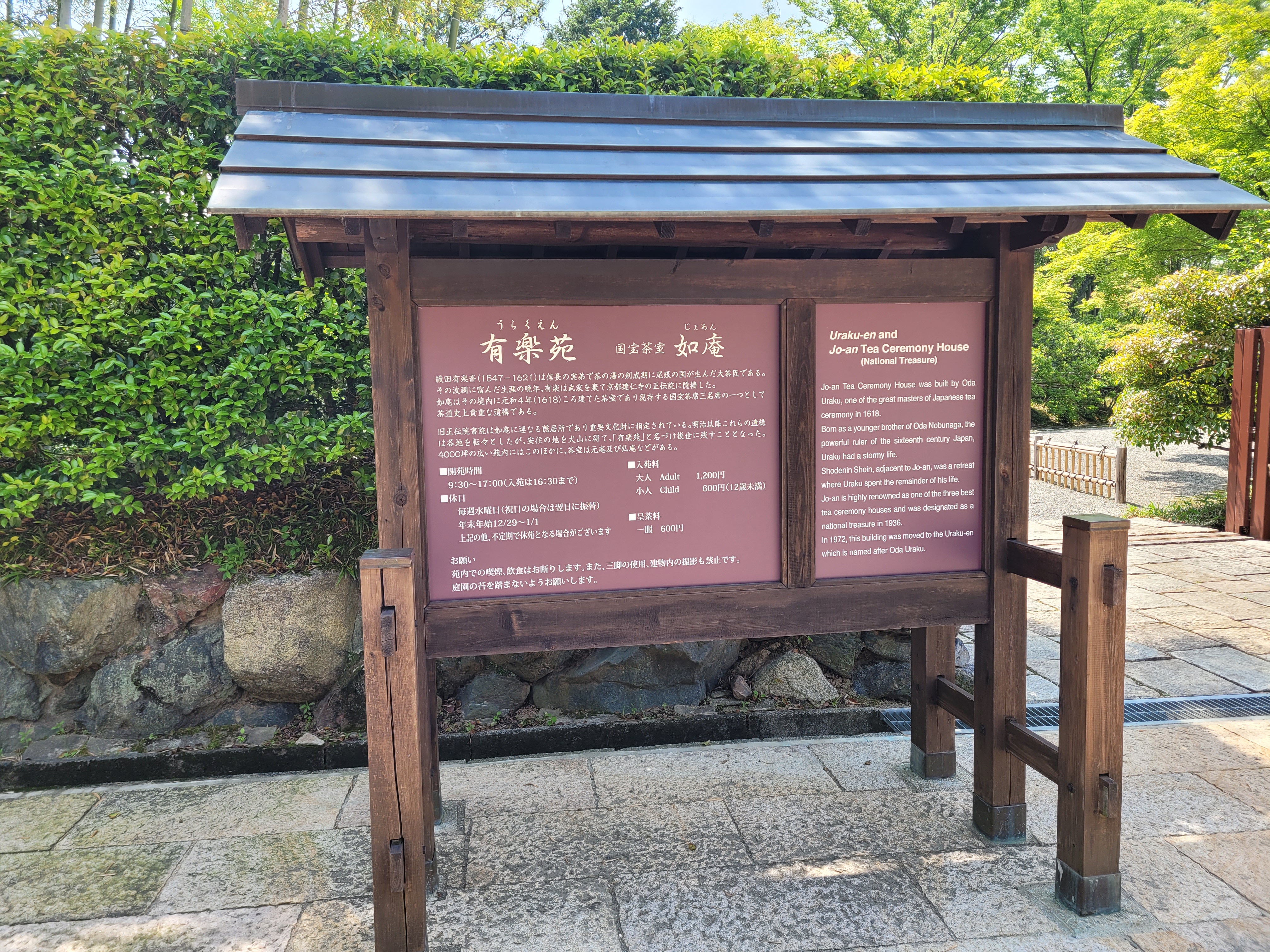 우라쿠엔 가든 입장료는 대인 1,200엔, 소인 600엔입니다. 차를 마시려면 추가로 요금을 더 내야해요. 호텔 인디고 투숙객 역시 추가 요금이 부과됩니다. 저희는 아침에 커피, 차를 마시고 와서 패스했습니다.