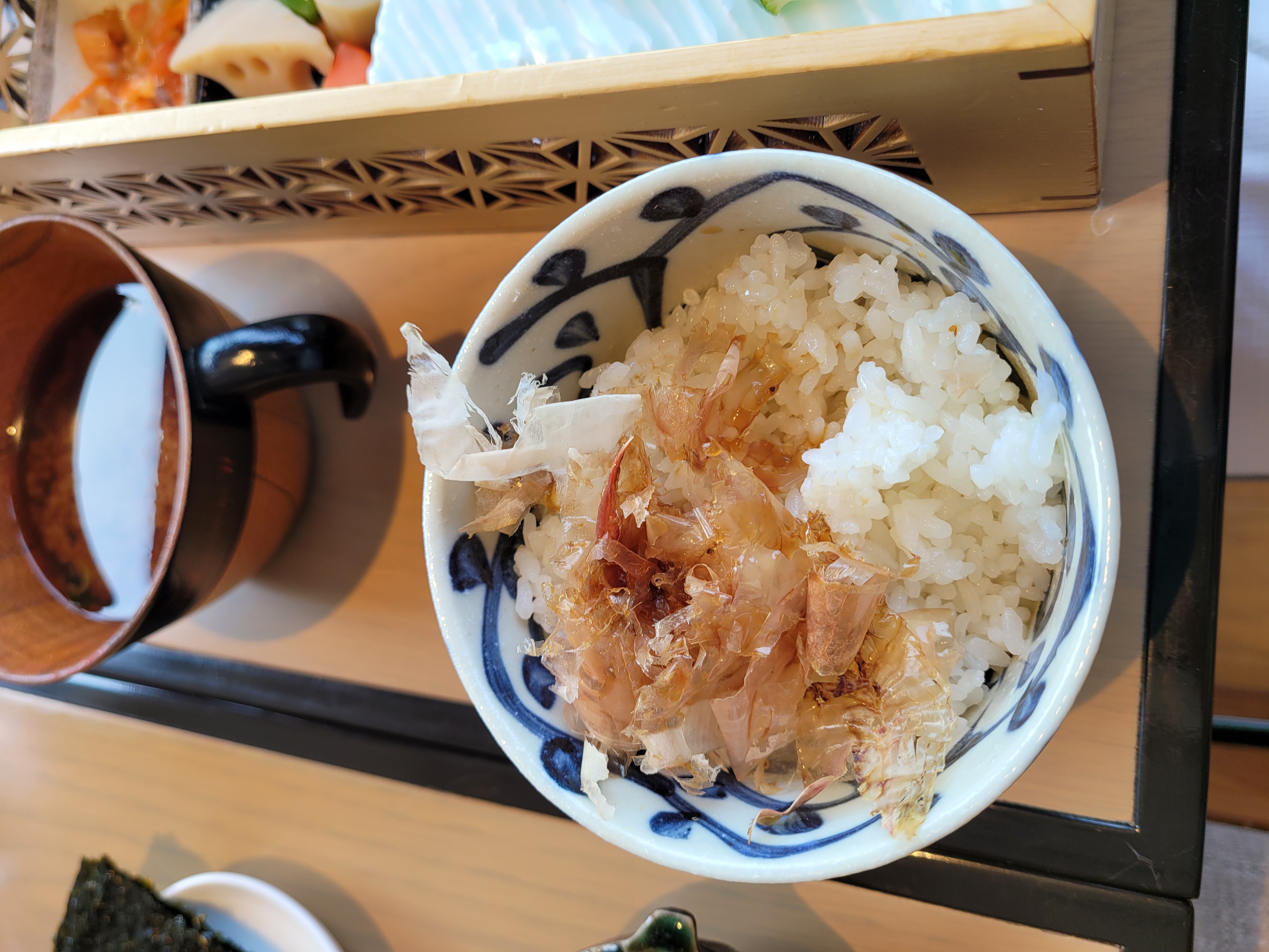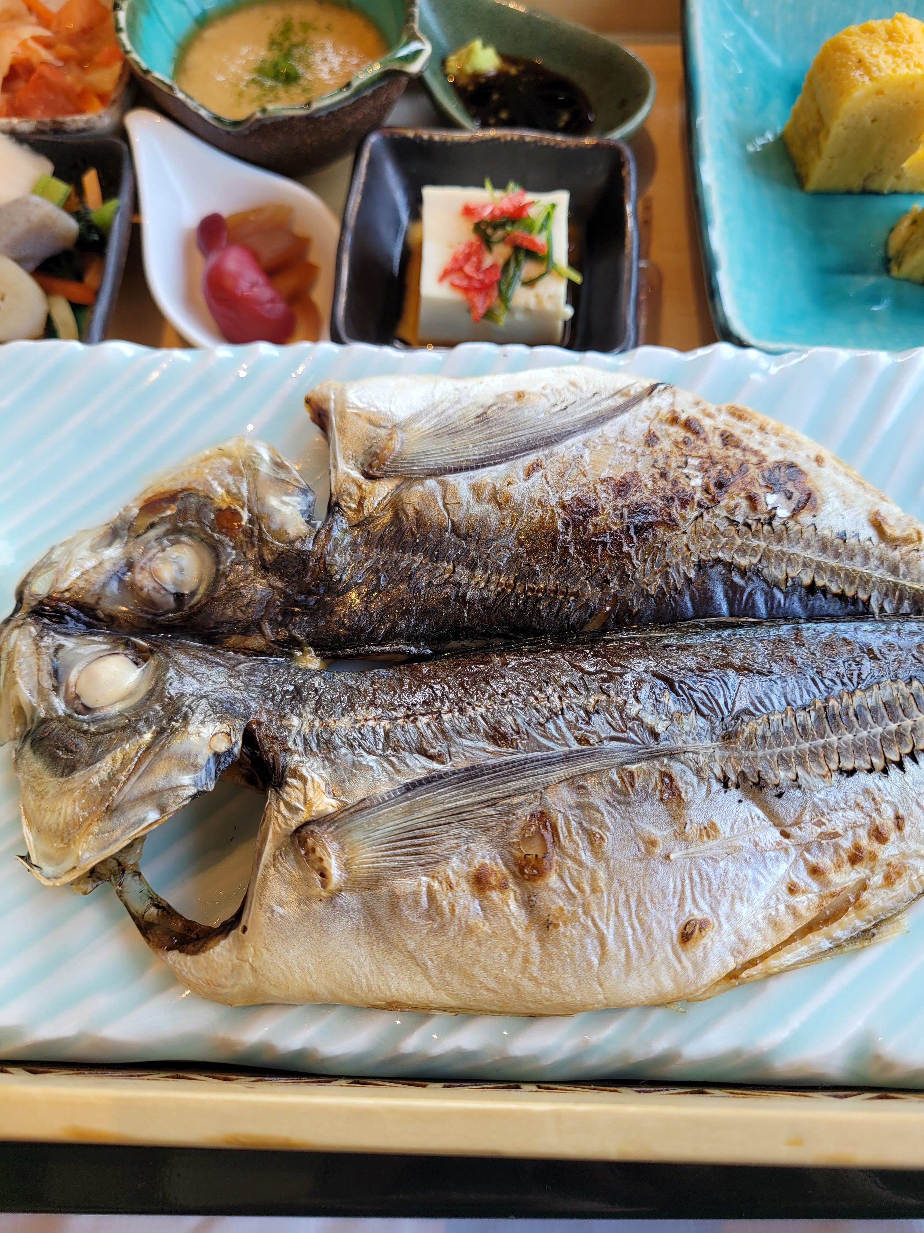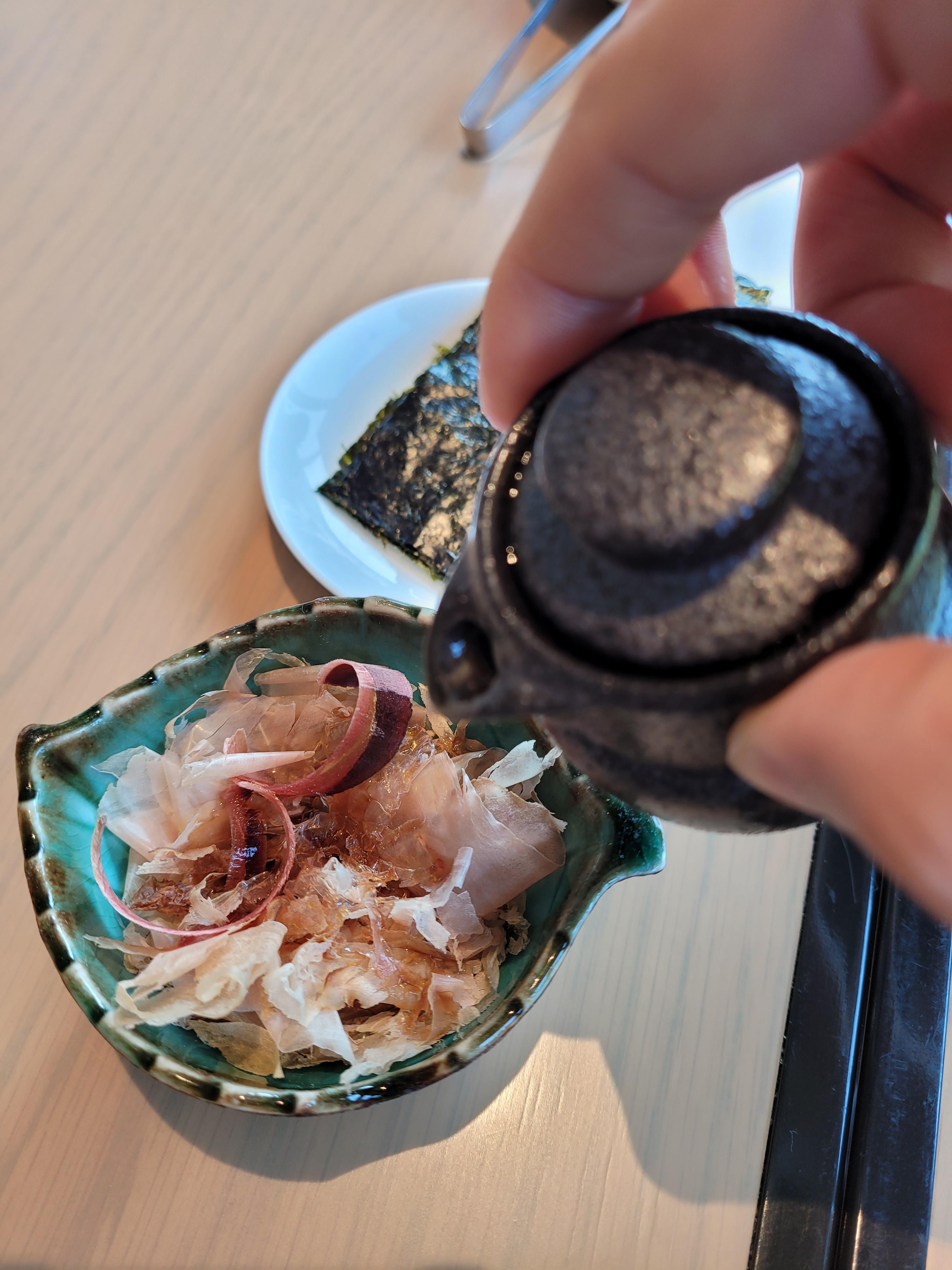 가쯔오부시에 간장을 부어 밥에 얹은 후에 김을 싸먹으면 별미입니다. 먹는 방법을 잘 몰랐지만 직원 분께서 친절하게 알려주셨어요. 저희가 일본어를 잘 못하기도 하고 직원분께서는 영어를 잘 못하셨지만 어찌저찌 소통해서 맛있게 먹었답니다. 참고로 저 김은 조식당에서 직접 굽습니다. 김도 정말 고소해요.