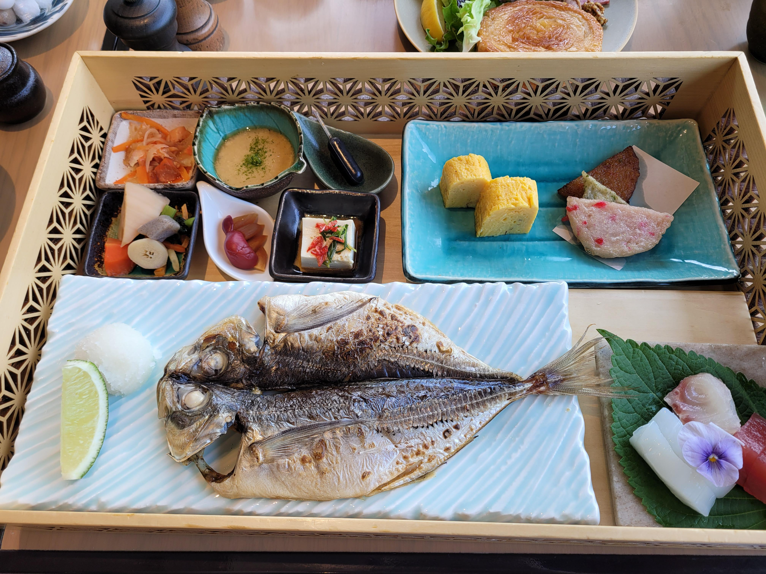 뷔페 음식을 조금 먹다보니 일식 한상차림이 제공되었어요. 쟁반, 식기류 자체도 고급스럽고 보기만 해도 정갈함이 느껴지지 않나요~? 일본 사이드 디쉬 몇 가지와 생선구이가 주를 이루었습니다. 생선은 수급에 따라 종류가 매일 바뀐다고 해요. 이번에 제가 먹은 생선은 한국에서 한 번도 먹어보지 못한 생선이었어요.