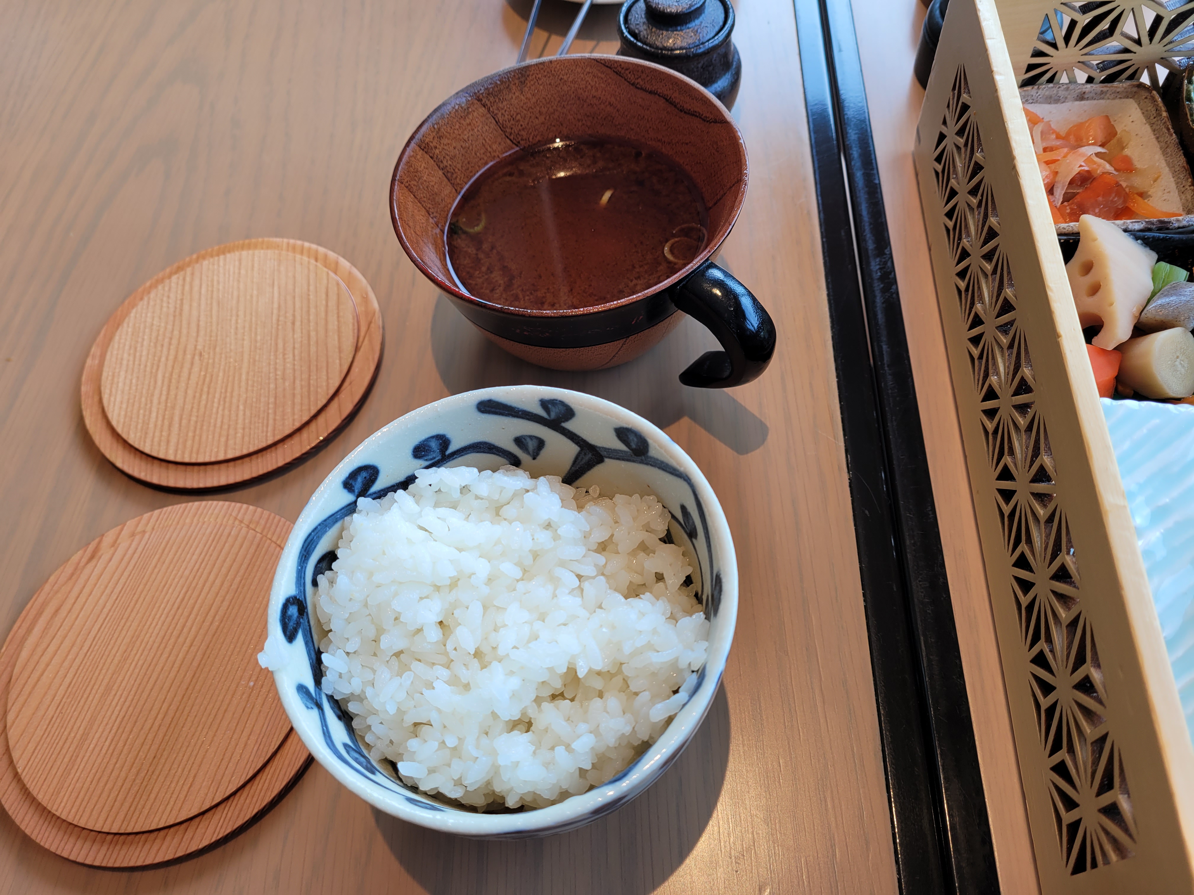 밥과 미소시루도 제공되었습니다. 일본에서 식사를 할 때 미소시루는 꼭 빠지지 않는 것 같더군요. 한국과 달리 스푼은 달라고 하지 않으면 주지 않습니다. 사진 속 미소시루를 보시면 컵 같은 용기에 제공되어 편하게 마셔 먹으라는 것 같아요.