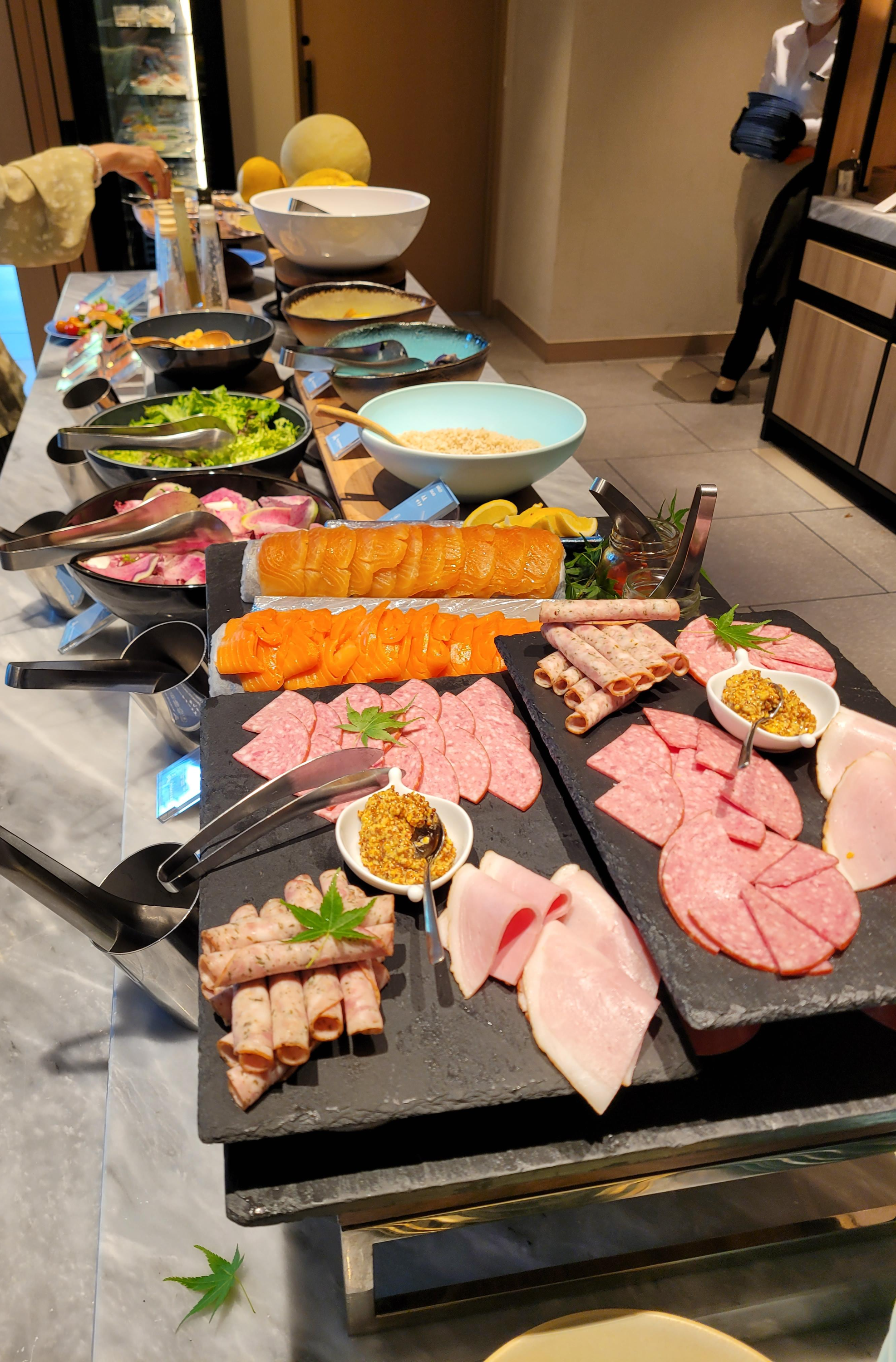 각종 햄과 연어의 종류도 다양하고 식전에 간단히 먹을 수 있는 샐러드를 제공하고 있었어요. 저는 뷔페로 배를 채우면 일식 한상차림 메뉴를 즐기지 못할 것 같아서 샐러드 위주로 담았어요.